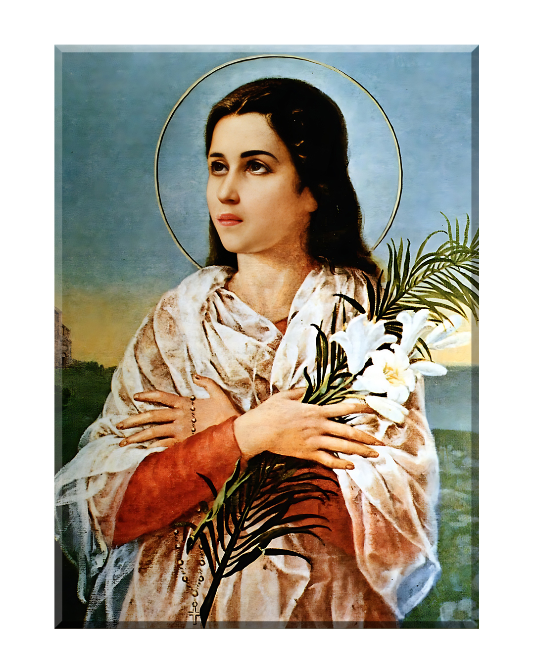 Maria Teresa Goretti była młodą włoską świętą i męczennicą Kościoła katolickiego, znana ze swojej głębokiej wiary i siły ducha. Urodziła się w 1890 roku w Corinaldo, we Włoszech, w ubogiej, lecz głęboko religijnej rodzinie rolniczej. Maria Teresa stała się symbolem czystości i odpuszczenia, gdyż w 1902 roku, mając zaledwie 12 lat, została śmiertelnie ranna przez Alessandro Serenellego, młodego mężczyznę, który próbował ją zgwałcić. Przed śmiercią wybaczyła swojemu napastnikowi, modląc się za jego nawrócenie, co miało ogromny wpływ na jego przyszłe życie i nawrócenie. Maria Teresa Goretti została kanonizowana w 1950 roku przez papieża Piusa XII. Jej życie i śmierć są przykładem niezachwianej wiary i wytrwałości w obliczu cierpienia, a jej historia porusza wiernych na całym świecie.Patronka
