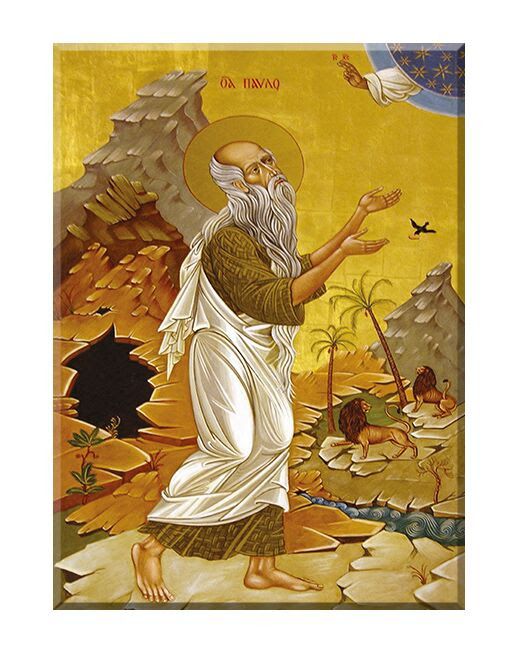 Święty Paweł z Teb, znany także jako Paweł Pierwszy Pustelnik, jest uważany za jednego z pierwszych pustelników chrześcijańskich i założyciela monastycyzmu pustelniczego. Urodził się około roku 227 w Egipcie, w zamożnej rodzinie, ale po śmierci rodziców i prześladowaniach chrześcijan za cesarza Decjusza, zdecydował się wycofać na pustynię. Spędził tam większość swojego życia w całkowitym odosobnieniu, oddając się modlitwie i kontemplacji.Jego życie zostało opisane przez św. Hieronima, który relacjonuje, jak Paweł żył w jaskini, karmiony przez kruki, które dostarczały mu połówki chleba każdego dnia. Śmierć Świętego Pawła, który według tradycji dożył wieku 113 lat, zbiegła się z przybyciem do jego pustelni innego wielkiego eremity, św. Antoniego, który pochował go, wykonując dla niego habit z własnych rąk. Święty Paweł z Teb jest często przedstawiany z palmą męczeństwa, co symbolizuje jego ascetyczne życie i świętość. Jego wspomnienie liturgiczne obchodzone jest 15 stycznia.