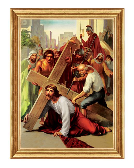 Obraz o tematyce biblijnej poruszający motyw drogi krzyżowej. Jezus upada na ziemię pod ciężarem krzyża.