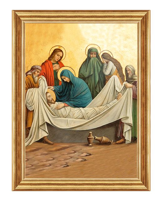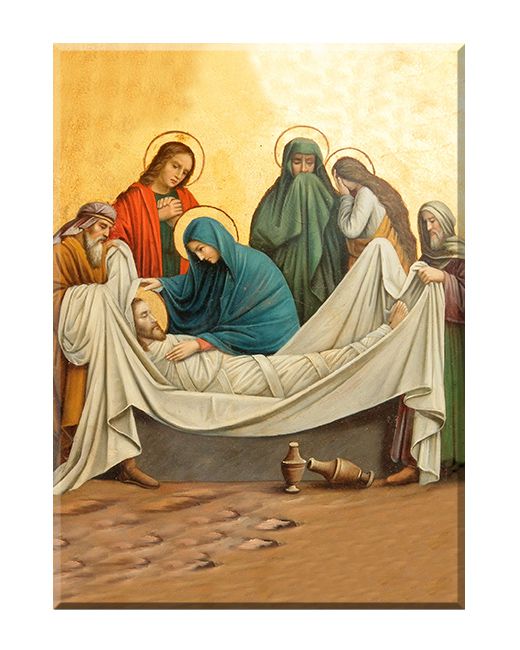 Obraz o tematyce biblijnej poruszający motyw drogi krzyżowej. Jezus Chrystus spoczywając w grobie