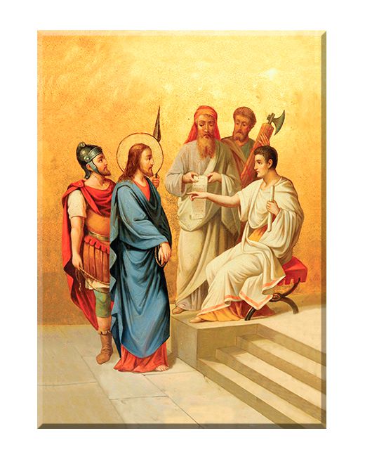 Obraz o tematyce biblijnej poruszający motyw drogi krzyżowej. Jezusa osądzali kolejno: Annasz, Kajfasz, Herod i Piłat.