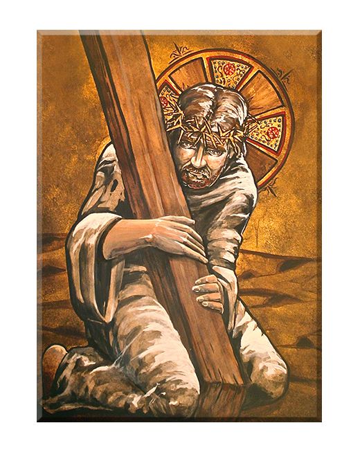 Obraz o tematyce biblijnej poruszający motyw drogi krzyżowej. Jezus, który po raz drugi upada z wysiłku,
