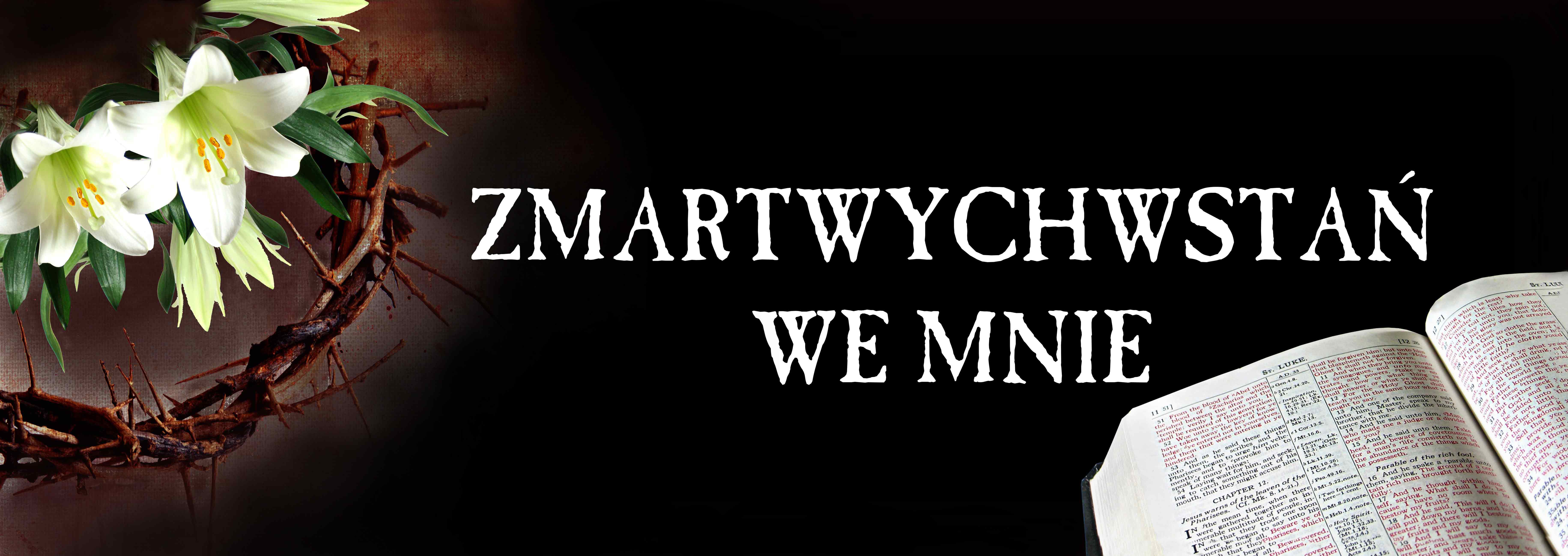 Baner okolicznościowy poziomy z napisem "Zmartwychwstań we mnie" na Wielki Post. Przeznaczony do dekoracji zewnętrznej i wewnętrznej.