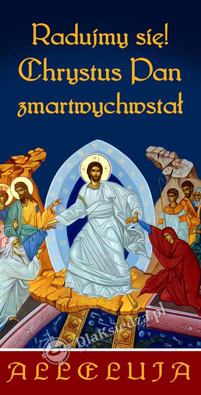 Baner okolicznościowy pionowy z napisem „Radujmy się! Chrystus Pan zmartwychwstał”. Przeznaczony do dekoracji zewnętrznej i wewnętrznej.