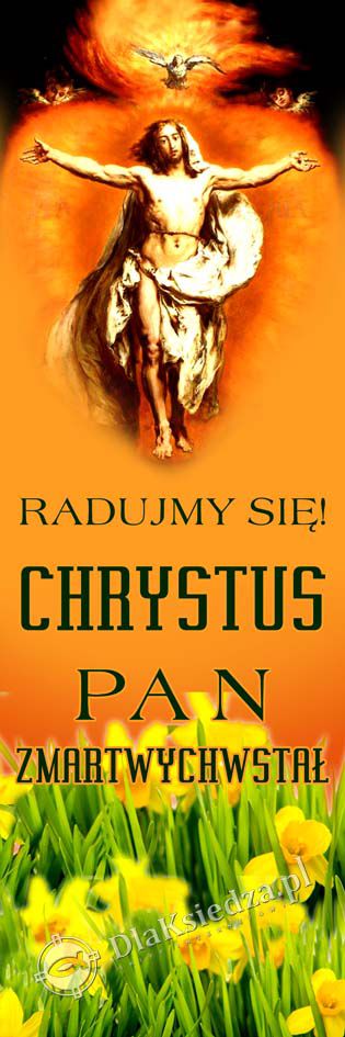 Baner okolicznościowy pionowy z napisem „Radujmy się! Chrystus Pan zmartwychwstał”. Przeznaczony do dekoracji zewnętrznej i wewnętrznej.