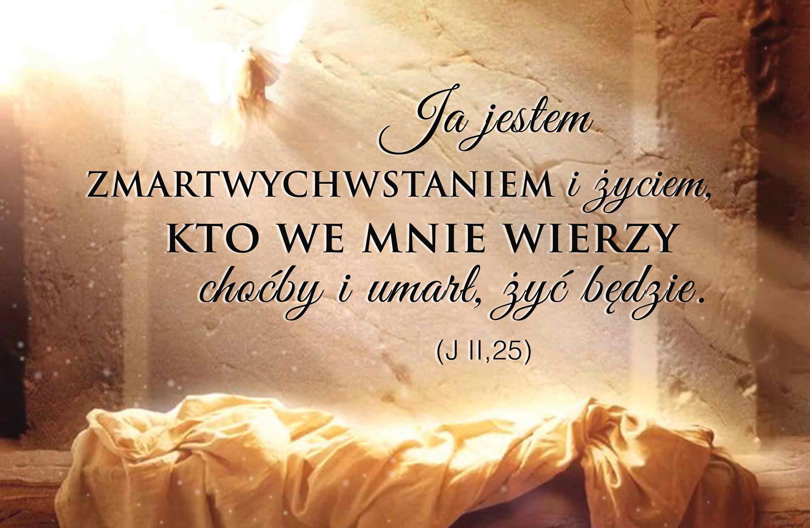 Baner okolicznościowy poziomy z napisem „Ja jestem zmartwychwstaniem i życiem, kto we mnie wierzy i choćby umarł, żyć będzie”. Przeznaczony do dekoracji zewnętrznej i wewnętrznej.