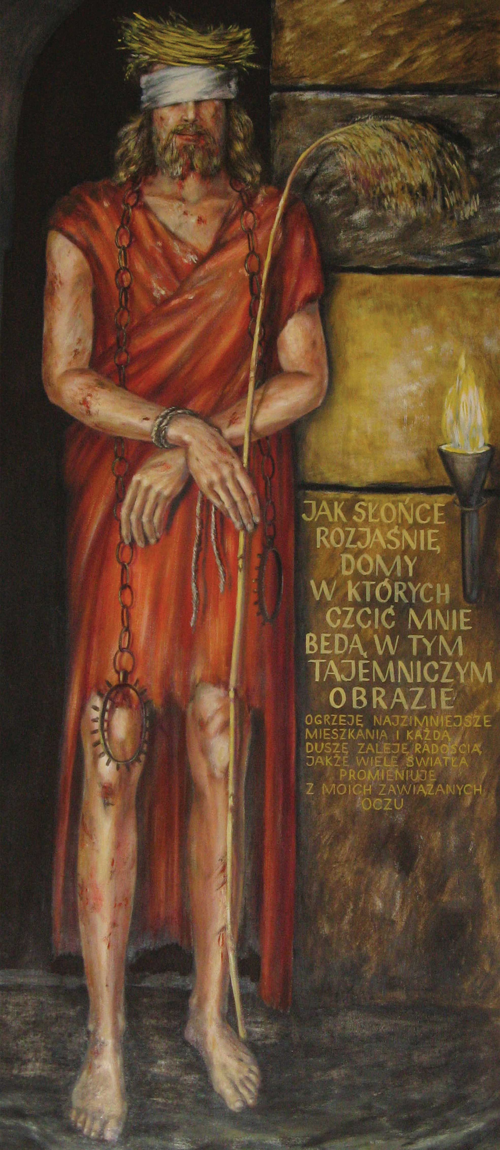Baner okolicznościowy pionowy z napisem „Jak słońce rozjaśnię domy, w których czcić mnie będą, w tym tajemniczym obrazie”. Przeznaczony do dekoracji zewnętrznej i wewnętrznej.