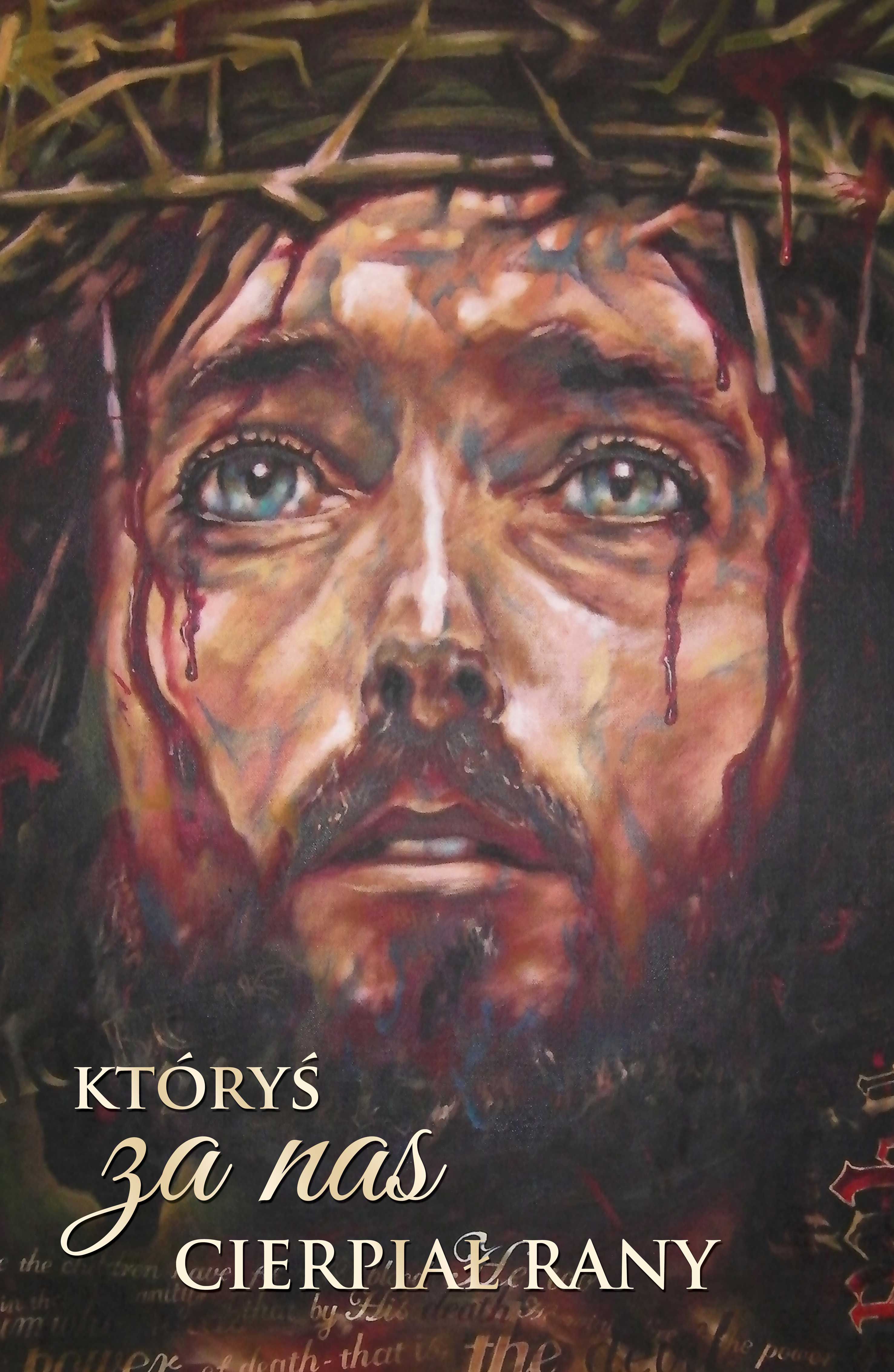 Baner okolicznościowy pionowy z napisem „Któryś za nas cierpiał rany”. Przeznaczony do dekoracji zewnętrznej i wewnętrznej.