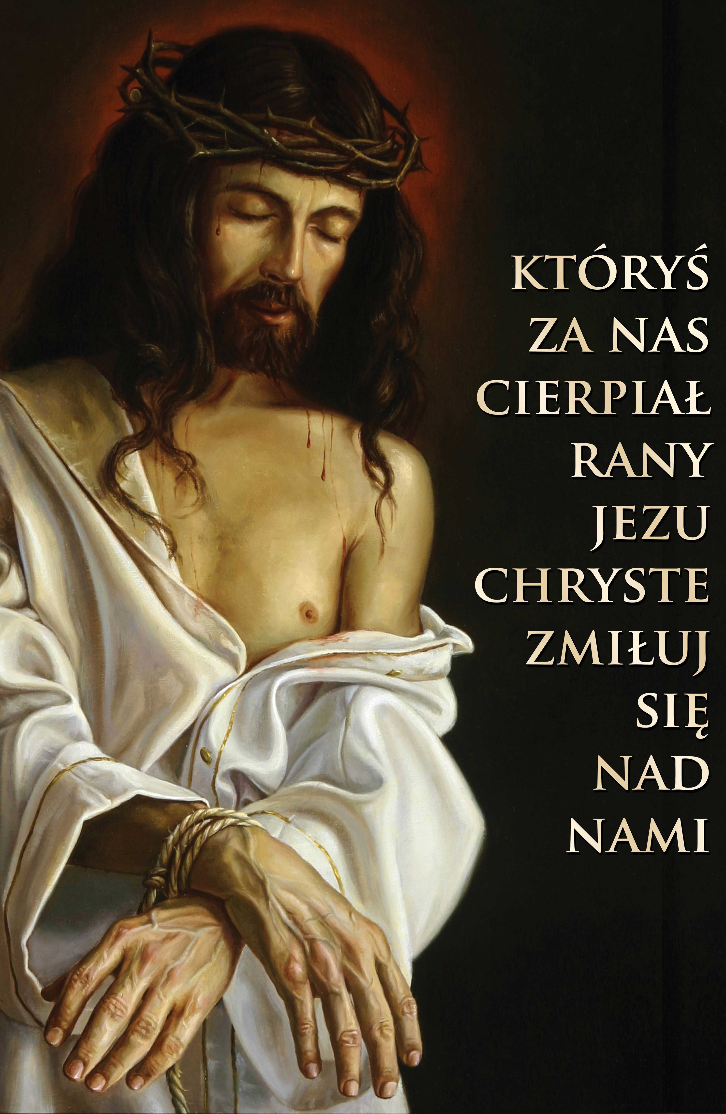 Baner okolicznościowy pionowy z napisem „Któryś za nas cierpiał rany, Jezu Chryste zmiłuj się nad nami”.