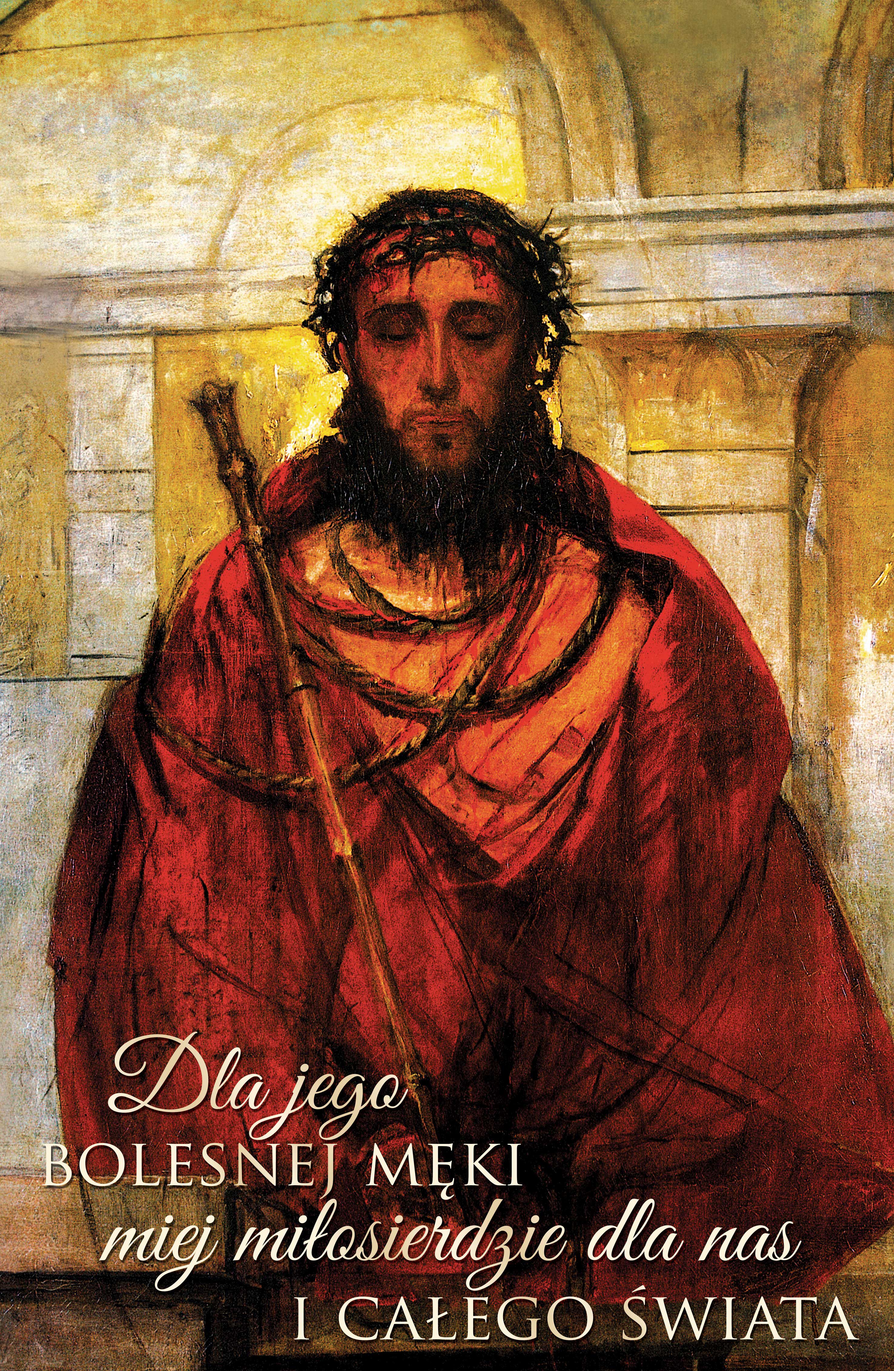 Baner okolicznościowy pionowy z napisem „Dla jego bolesnej męki, miej miłosierdzie dla nas i całego świata”.