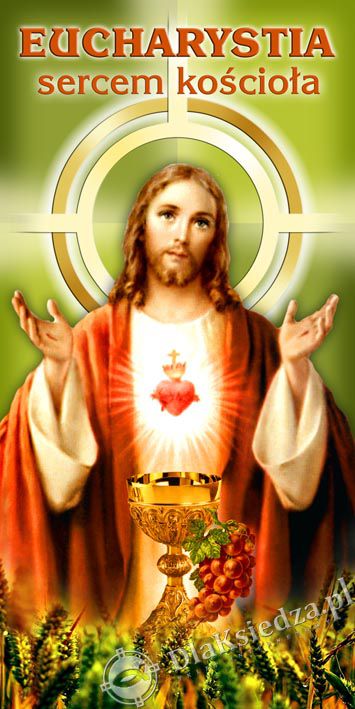 Baner okolicznościowy pionowy z napisem „Eucharystia sercem kościoła”. Przeznaczony do dekoracji zewnętrznej i wewnętrznej.