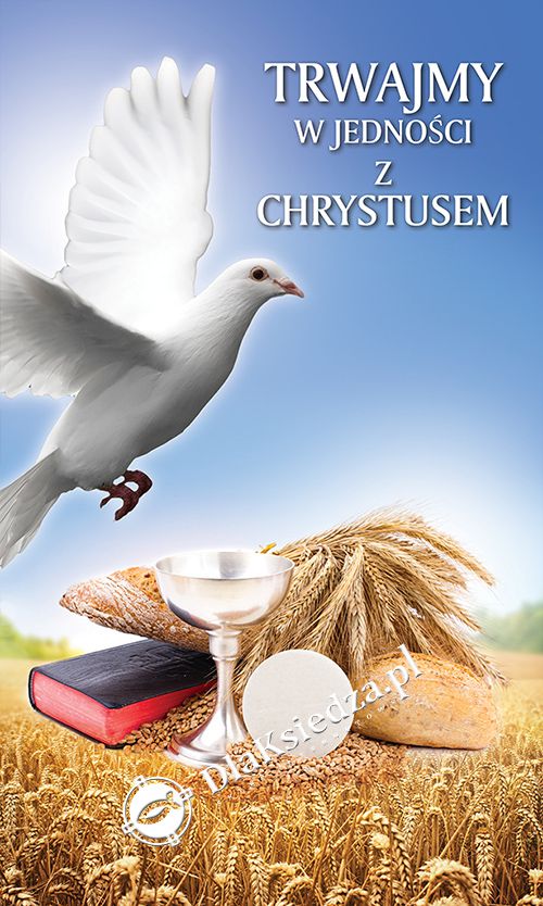 Baner okolicznościowy pionowy z napisem „Trwajmy w jedności z Chrystusem”. Przeznaczony do dekoracji zewnętrznej i wewnętrznej.