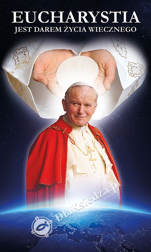 Baner okolicznościowy pionowy z napisem „Eucharystia jest darem życia wiecznego”. Przeznaczony do dekoracji zewnętrznej i wewnętrznej.