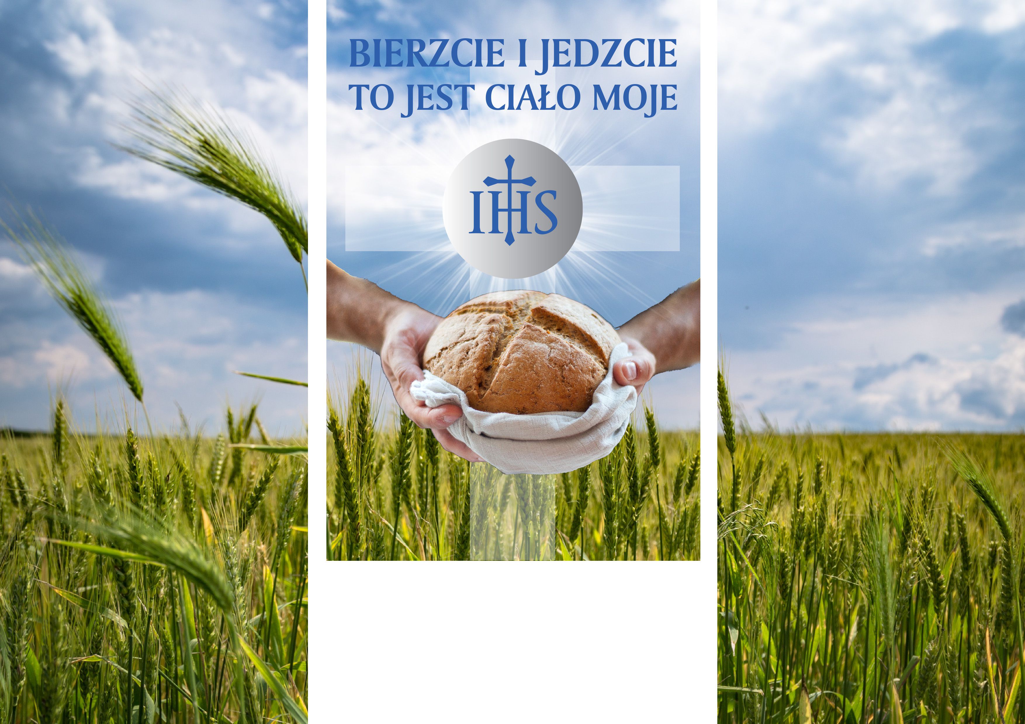 Banery okolicznościowe pionowe z napisem „Bierzcie i jedzcie, to jest ciało moje”. Przeznaczone do dekoracji zewnętrznej i wewnętrznej.
