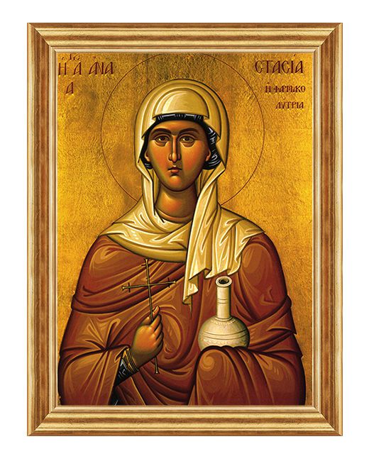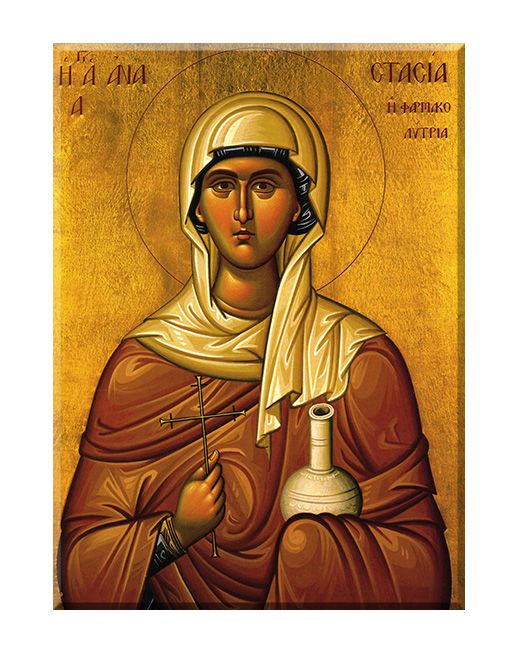 Męczennica, święta Kościoła katolickiego i prawosławnego. Święta Anastazja przedstawiana jest z palmą w ręku, z mieczem, nożycami (jako symbolem cenzury) lub z naczyniem na maść.Patronka