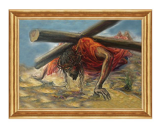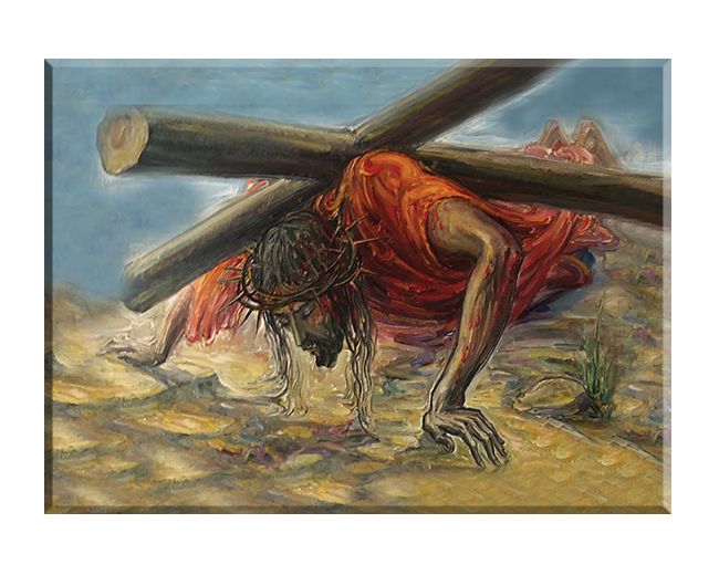 Obraz o tematyce biblijnej poruszający motyw drogi krzyżowej. Chciałbym Jezu aby nie było nikogo na świecie