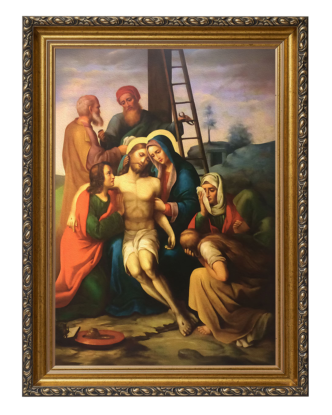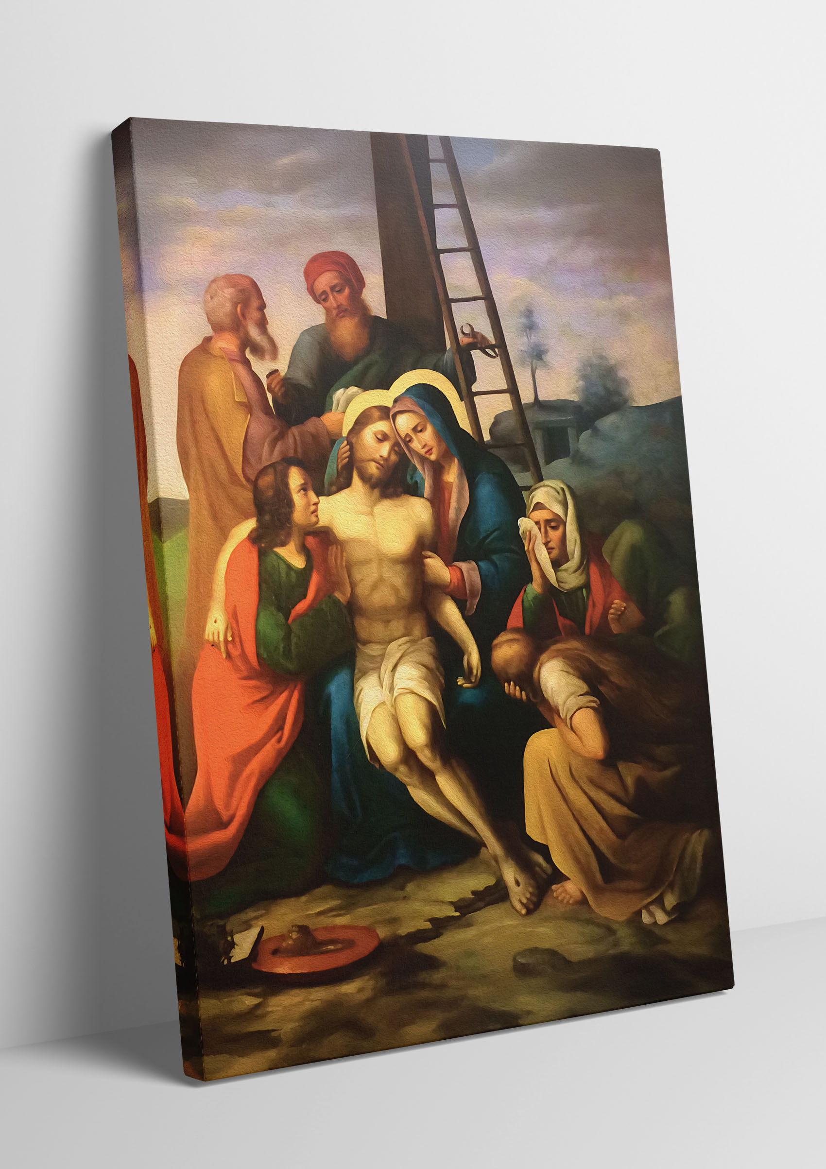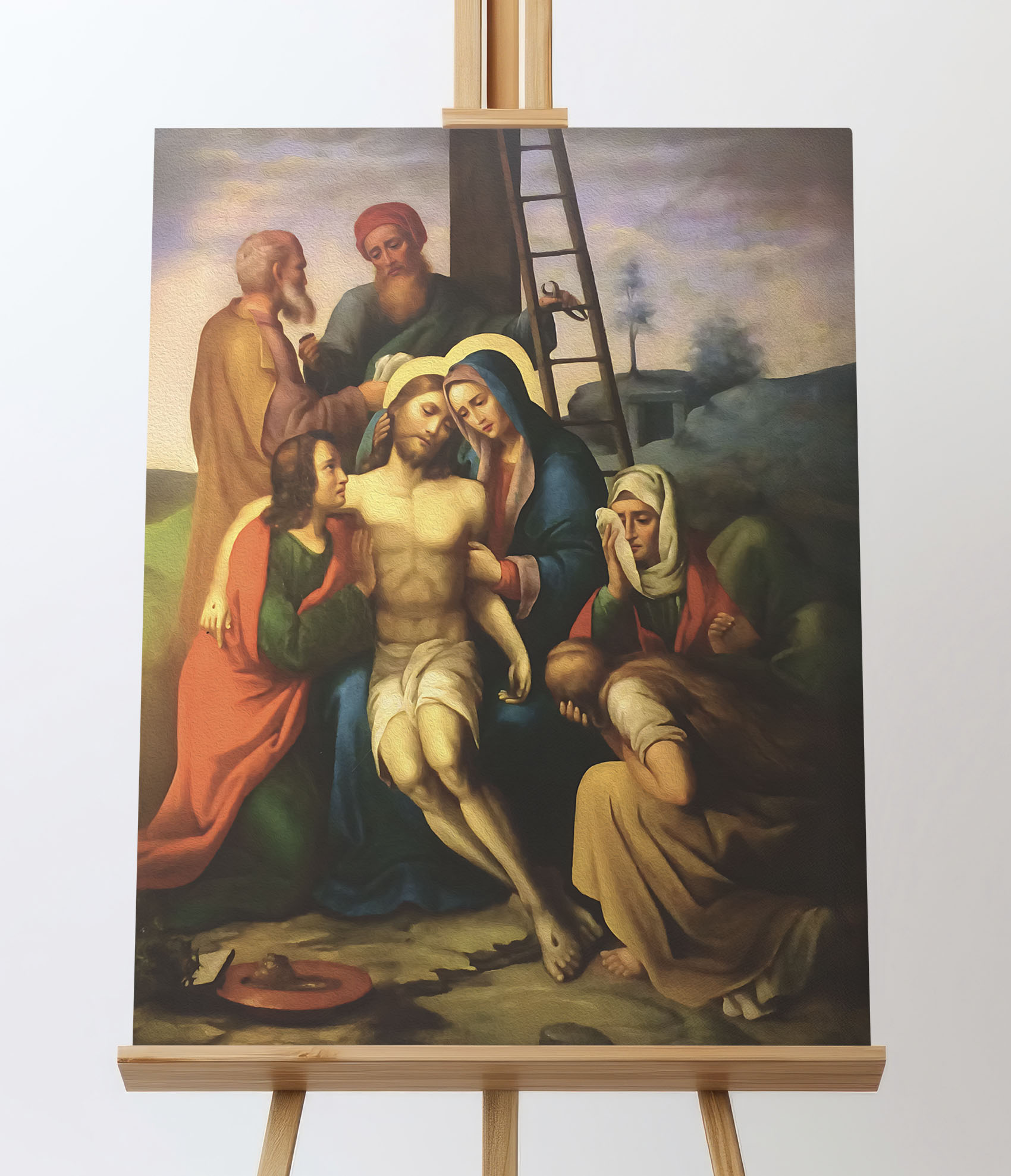 Obraz o tematyce biblijnej poruszający motyw drogi krzyżowej. Jezu, złożony w ramiona bolejącej Matki,