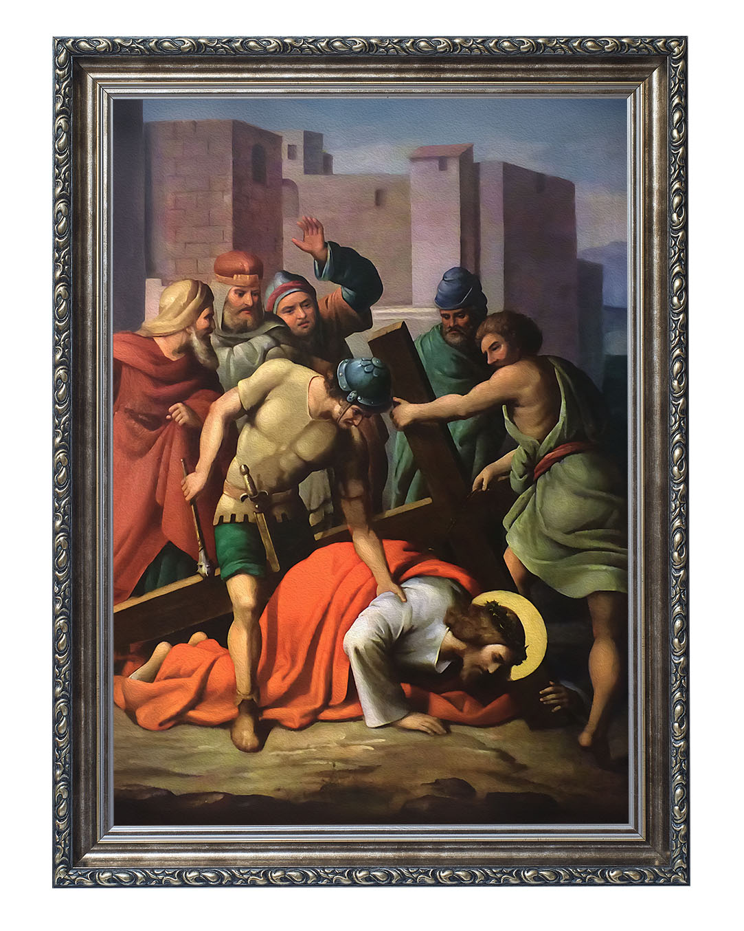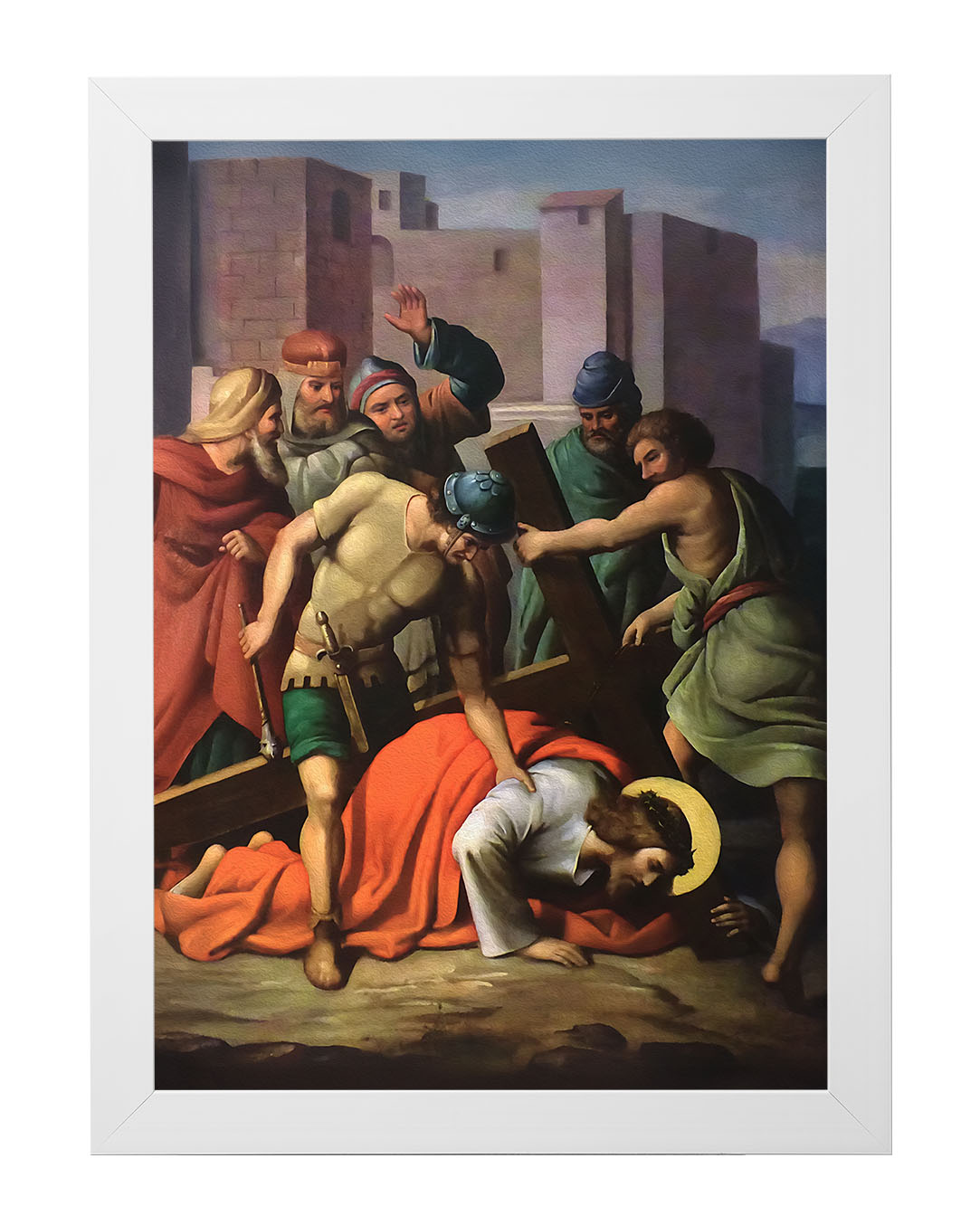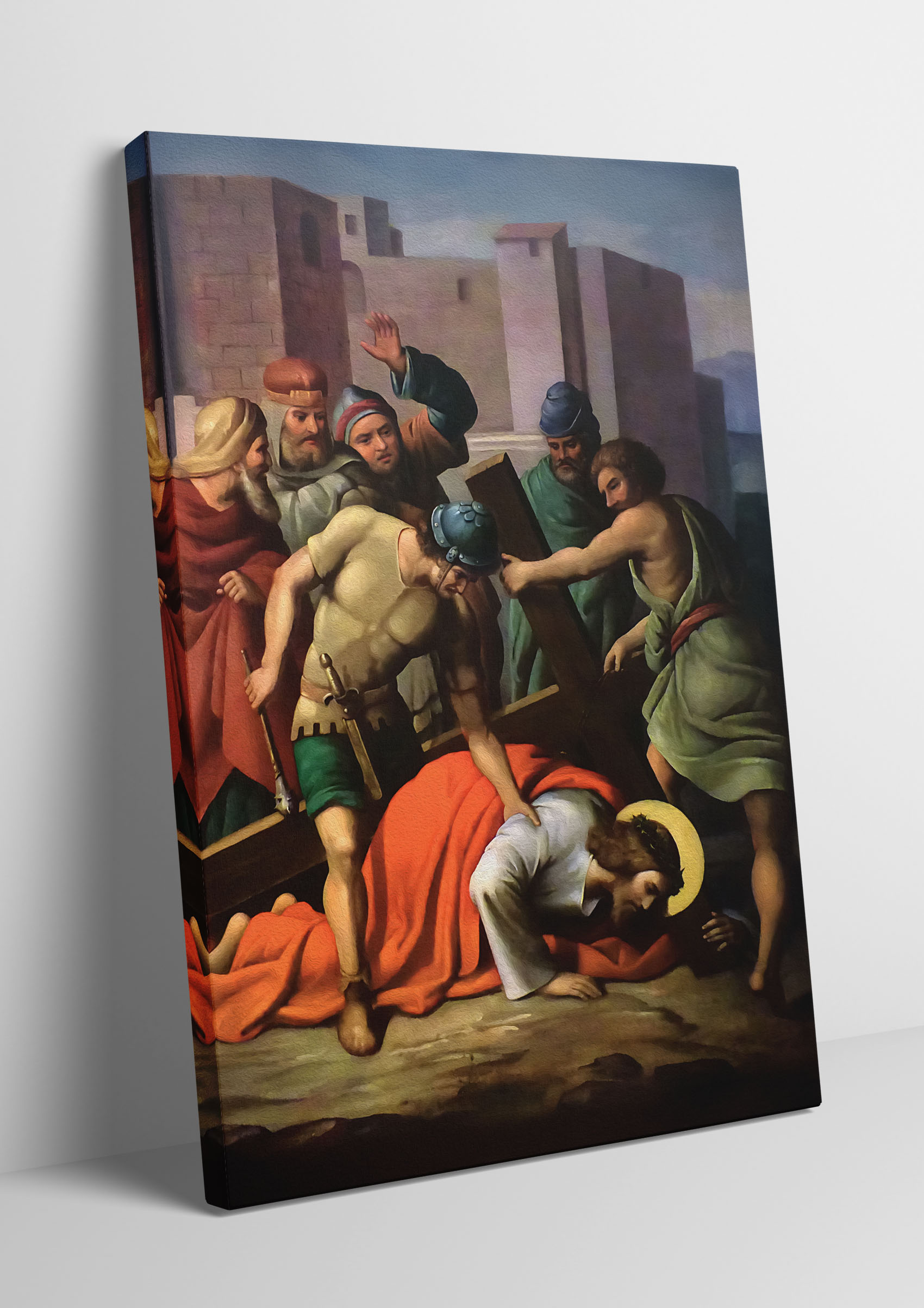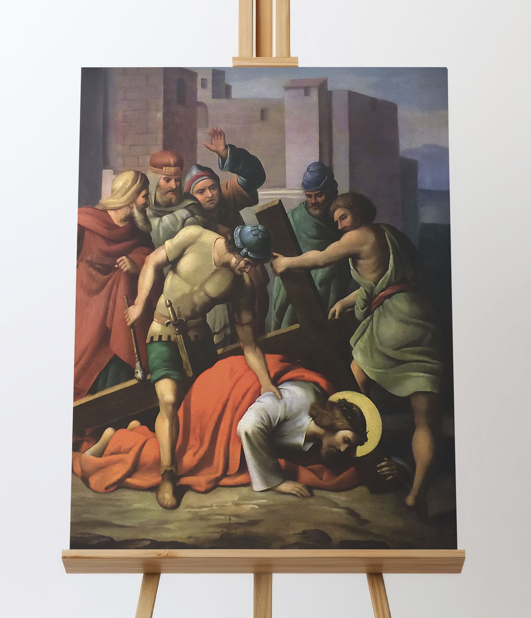 Obraz o tematyce biblijnej poruszający motyw drogi krzyżowej. Jezu, dźwigający upadających,