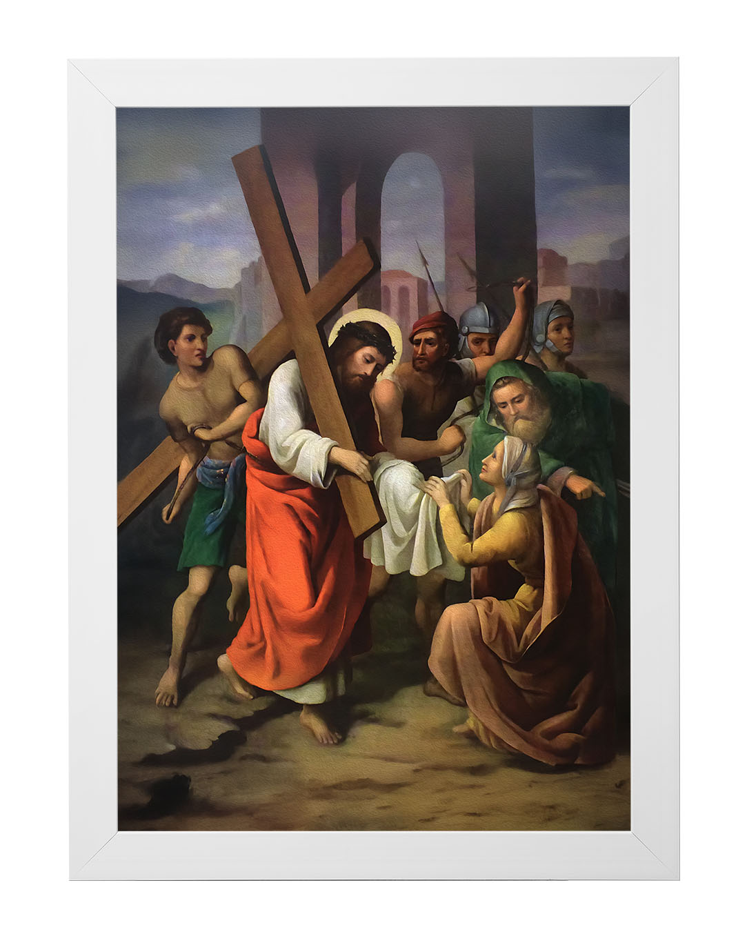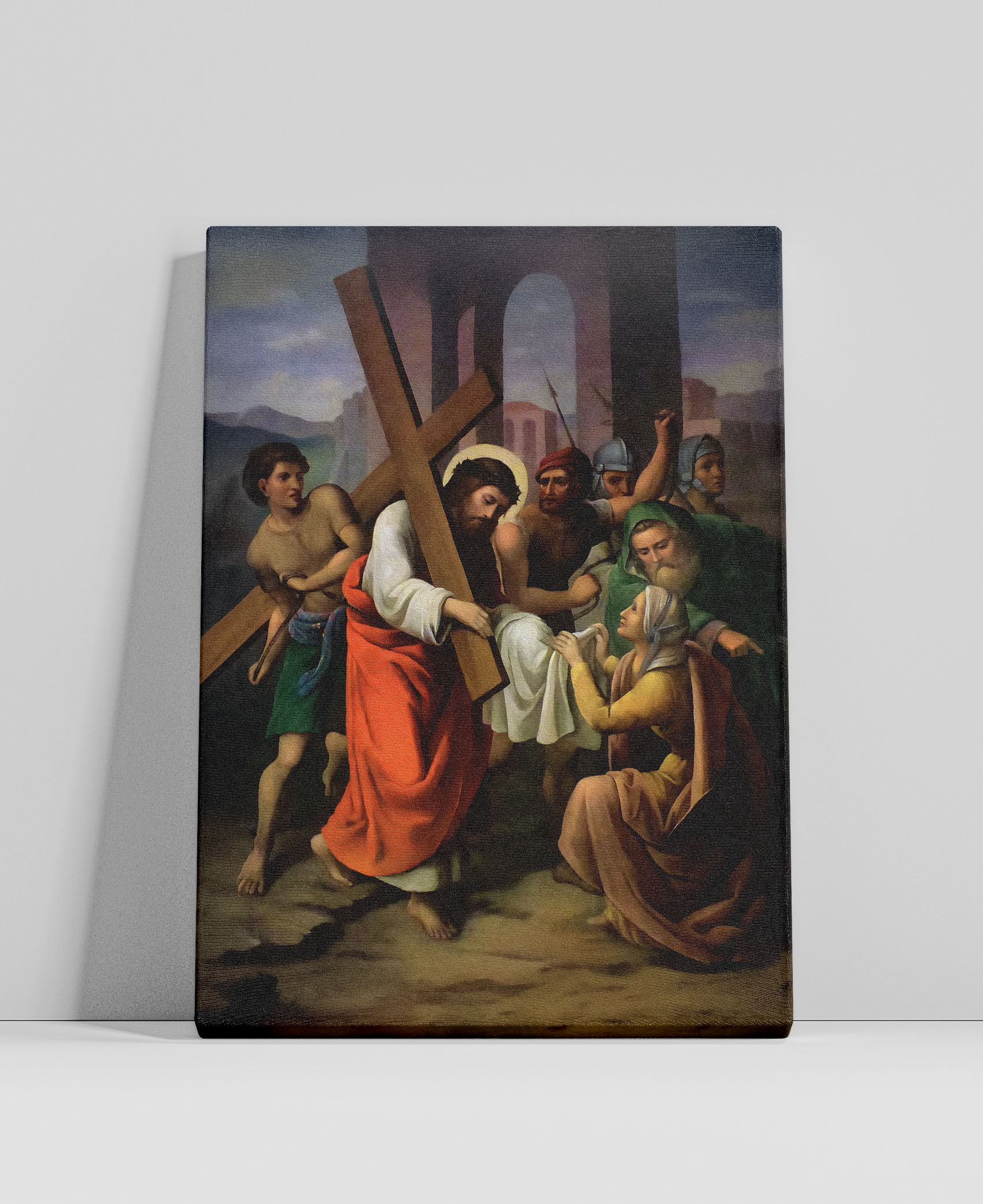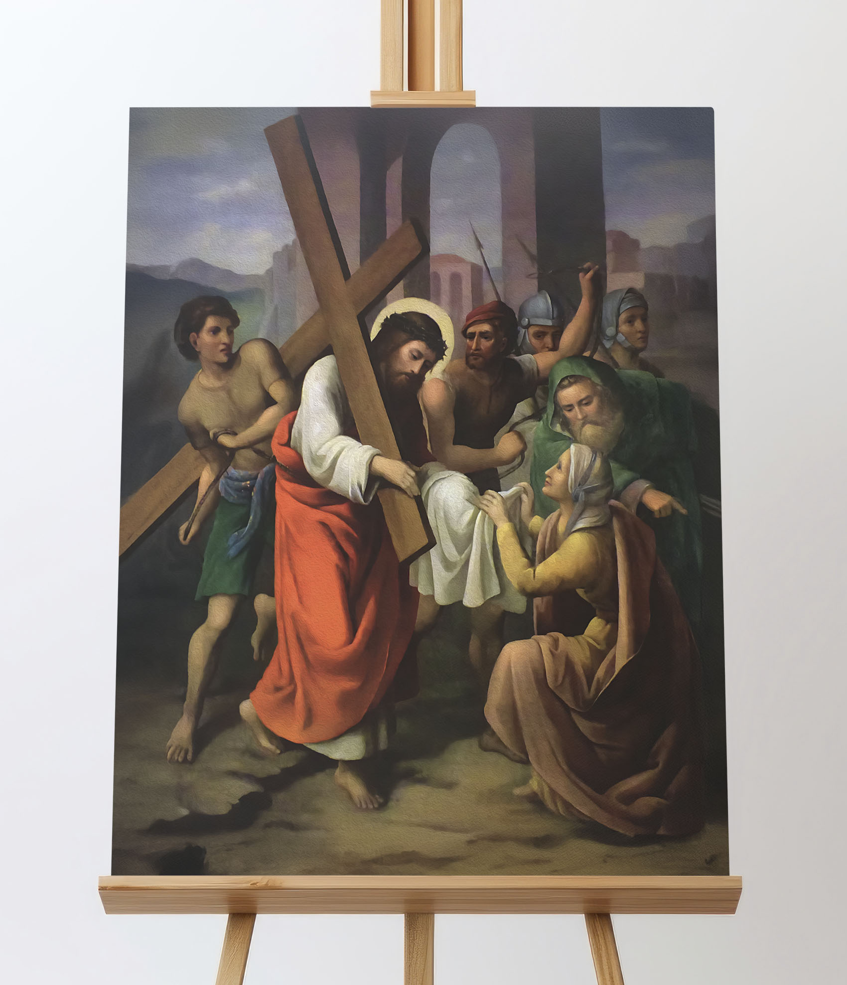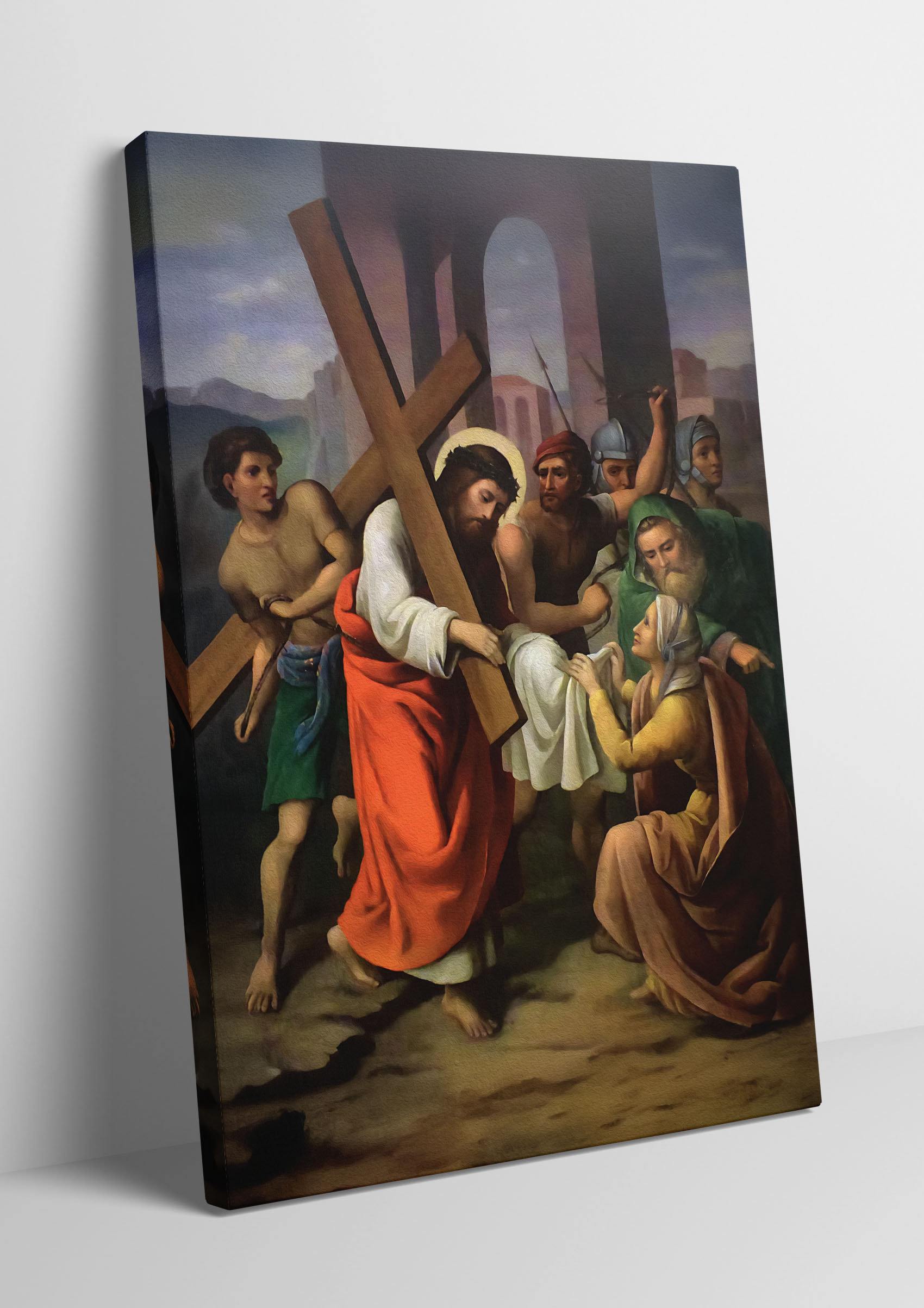 Obraz o tematyce biblijnej poruszający motyw drogi krzyżowej. Jezu, obdarzający Weronikę