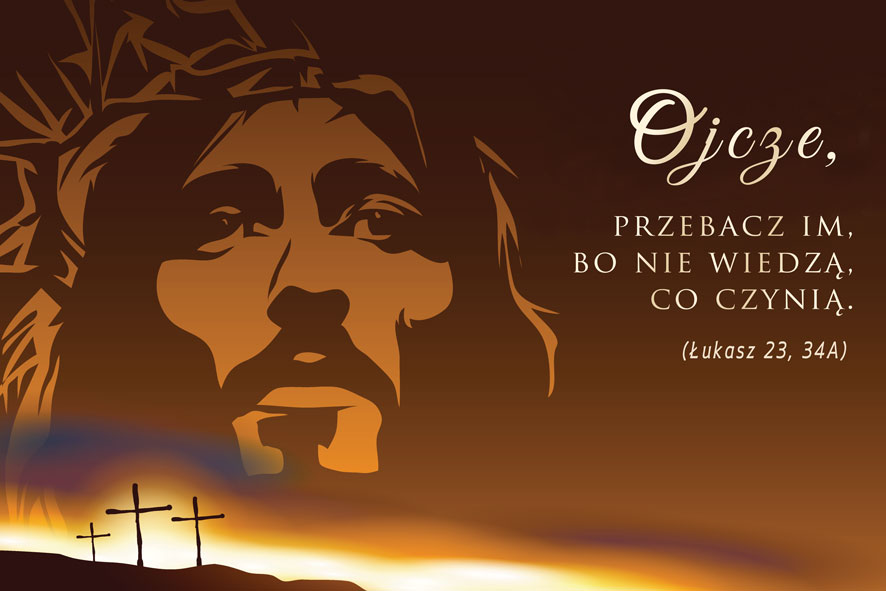 Baner okolicznościowy poziomy z cytatem z Ewangelii Św. Łukasza „Ojcze, przebacz im, bo nie wiedzą co czynią”. Przeznaczony do dekoracji zewnętrznej i wewnętrznej.