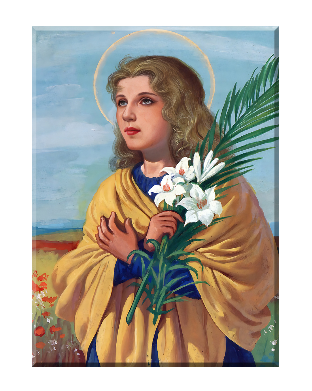 Maria Teresa Goretti była młodą włoską świętą i męczennicą Kościoła katolickiego, znana ze swojej głębokiej wiary i siły ducha. Urodziła się w 1890 roku w Corinaldo, we Włoszech, w ubogiej, lecz głęboko religijnej rodzinie rolniczej. Maria Teresa stała się symbolem czystości i odpuszczenia, gdyż w 1902 roku, mając zaledwie 12 lat, została śmiertelnie ranna przez Alessandro Serenellego, młodego mężczyznę, który próbował ją zgwałcić. Przed śmiercią wybaczyła swojemu napastnikowi, modląc się za jego nawrócenie, co miało ogromny wpływ na jego przyszłe życie i nawrócenie. Maria Teresa Goretti została kanonizowana w 1950 roku przez papieża Piusa XII. Jej życie i śmierć są przykładem niezachwianej wiary i wytrwałości w obliczu cierpienia, a jej historia porusza wiernych na całym świecie.Patronka