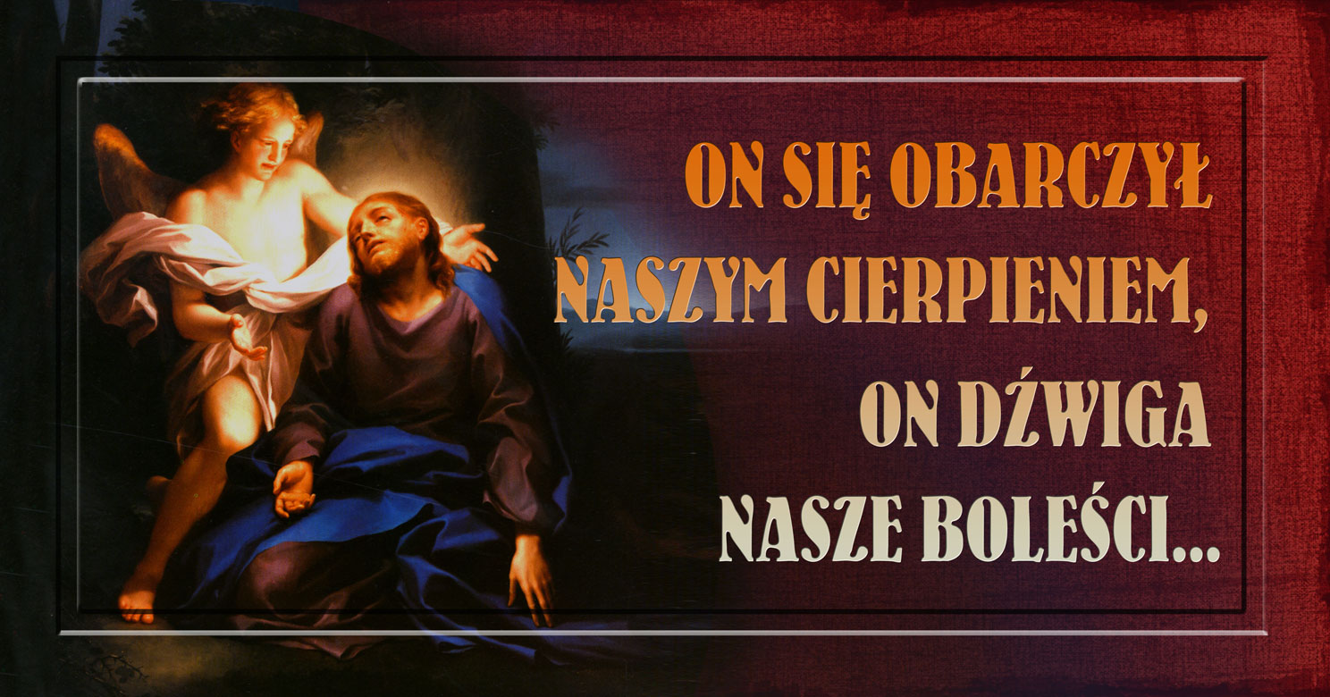 Baner okolicznościowy poziomy z napisem "On się obarczył naszym cierpieniem, on dźwiga nasze boleści...". Przeznaczony do dekoracji zewnętrznej i wewnętrznej.