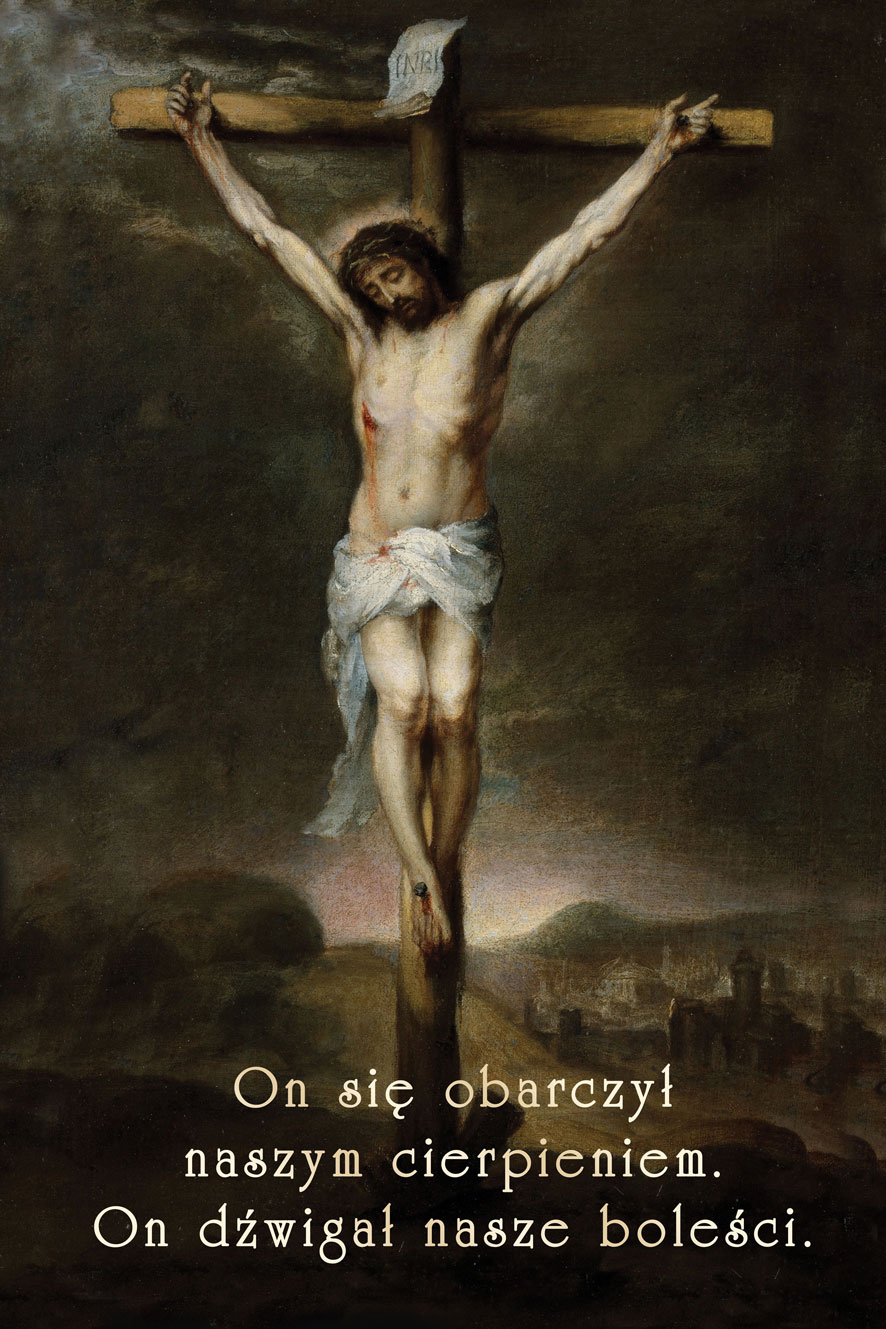 Baner okolicznościowy pionowy z napisem "On się obarczył naszym cierpieniem. On dźwigał nasze boleści". Przeznaczony do dekoracji zewnętrznej i wewnętrznej.