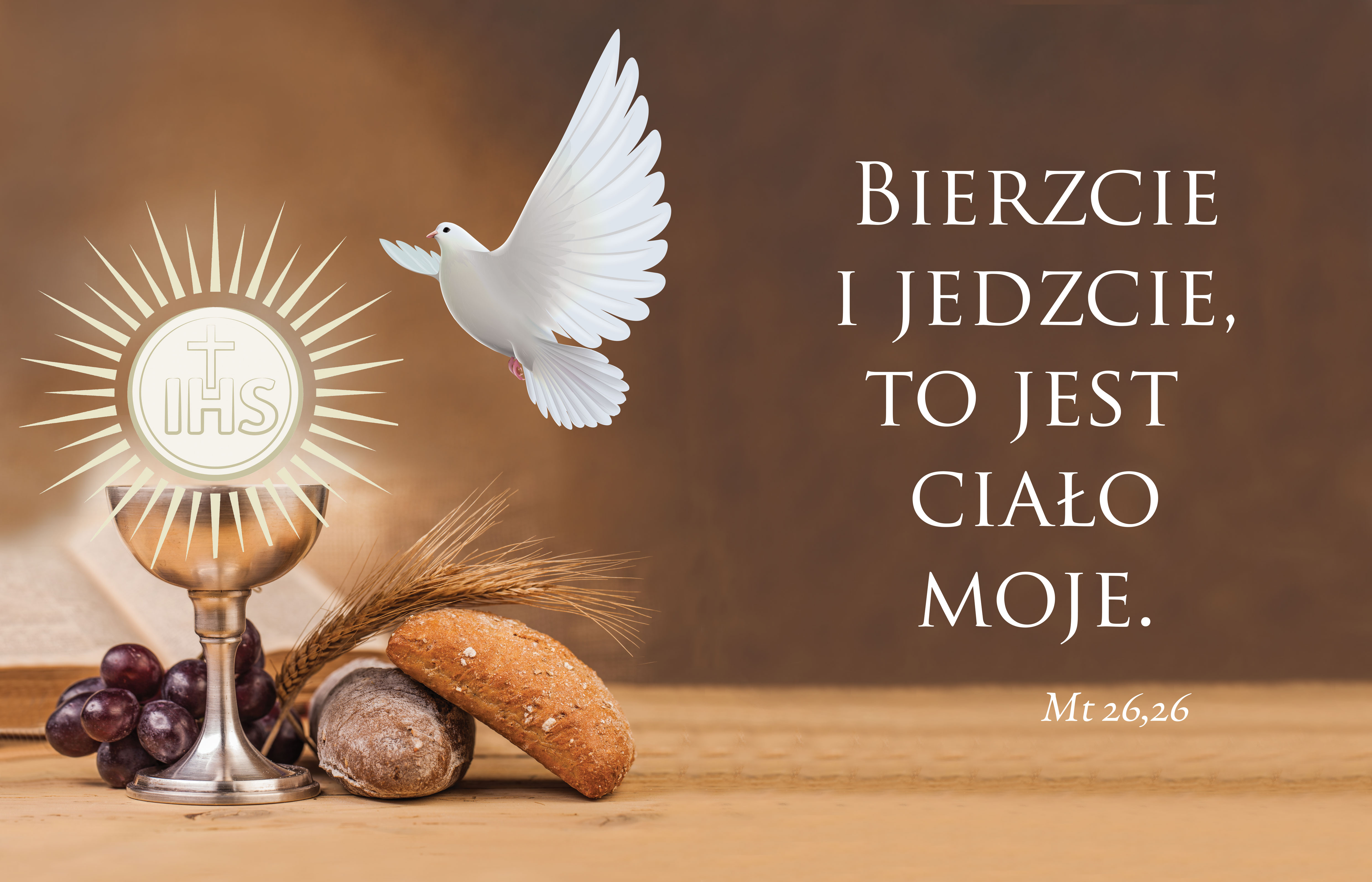 Baner okolicznościowy poziomy z napisem „Bierzcie i jedzcie, to jest ciało moje”. Przeznaczony do dekoracji zewnętrznej i wewnętrznej.