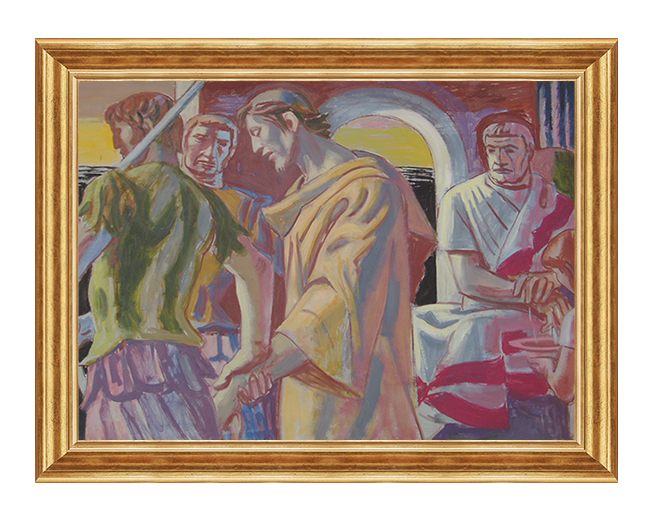 Obraz o tematyce biblijnej poruszający motyw drogi krzyżowej.Tłumy, które jeszcze niedawno wołały Hosanna!,