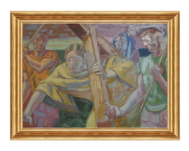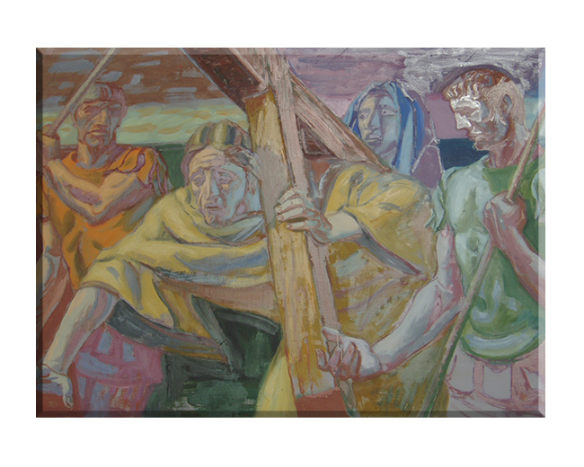 Obraz o tematyce biblijnej poruszający motyw drogi krzyżowej.Oto pierwszy upadek.