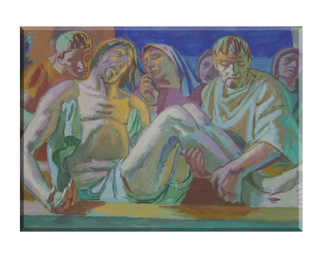Obraz o tematyce biblijnej poruszający motyw drogi krzyżowej.Chrystusowy pusty grób to jakby wrota otwarte w wieczność,