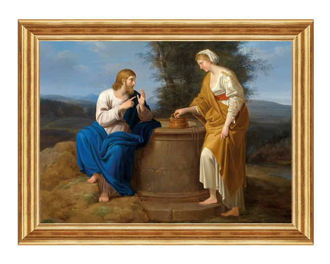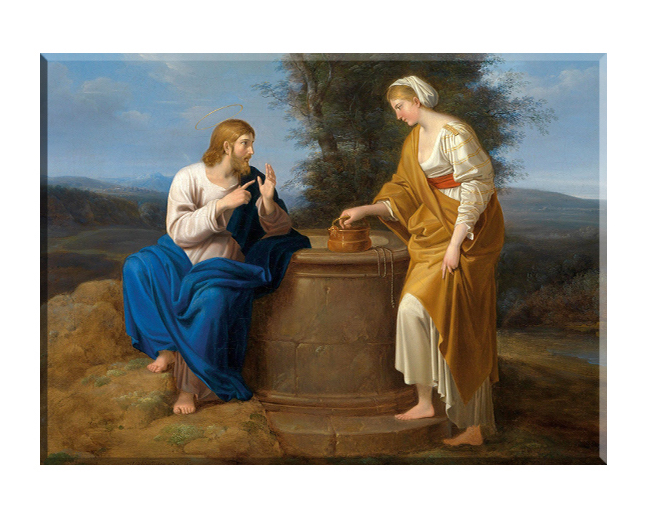Obraz przedstawia biblijną scenęrozmowy Pana Jezusa z kobietą z Sychar przy studni.