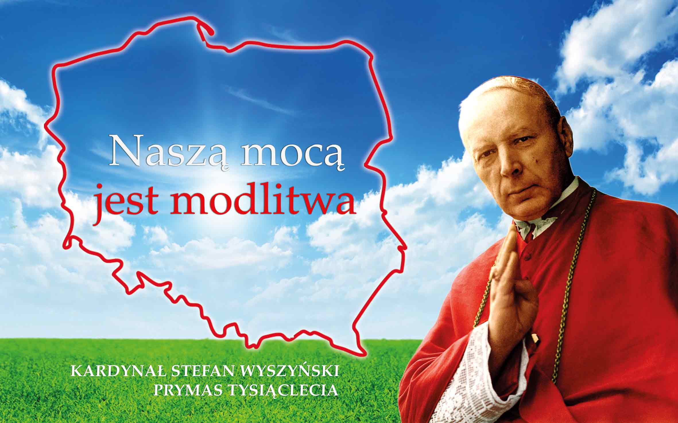 Baner pionowy z okazji beatyfikacji Kardynała Stefana Wyszyńskiego. Baner okolicznościowy z cytatem prymasa Wyszyńskiego.