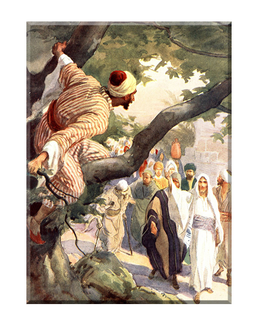Zacheusz występuje w Ewangelii św. Łukasza. Z powodu niskiego wzrostu, gdy przez Jerycho przechodził Jezus Chrystus, wspiął się na sykomorę, aby go zobaczyć. Jezus pozdrowił go i zapowiedział swoją wizytę w jego domu. Zacheusz oświadczył na to, że rozdaje połowę swojego majątku ubogim, a skrzywdzonych przez siebie wynagradza poczwórnie. Po tej deklaracji Jezus określił go jako prawdziwego syna Abrahama.