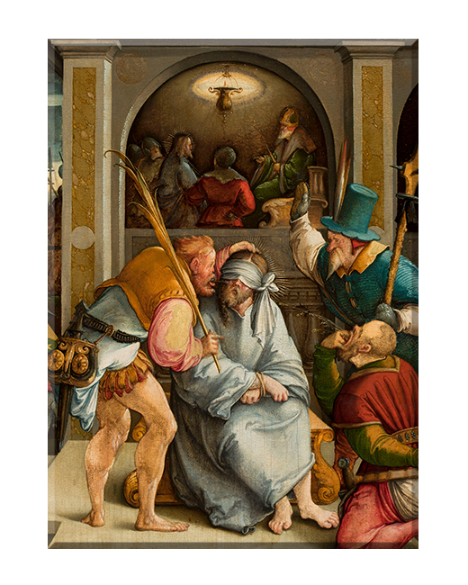 Obraz przedstawiający Naigrywanie z Jezusa.Pan Jezus to centralna postać religii chrześcijańskiej.