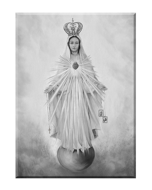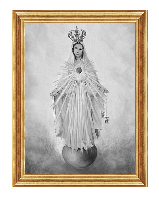 Matka Boża stoi na niebieskiej kuli – kula symbolizuje świat, a ponieważ jest koloru niebieskiego oznacza, że jest to świat już wyzwolony przez Chrystusa. W prawej ręce trzyma różaniec, a w lewej Brązowy Szkaplerz. Ramiona są otwarte – to gest otwartości, jak również hojności w rozdawaniu łask. Różaniec to moc i potęga modlitwy, a Brązowy Szkaplerz to ochrona. Na piersi Maryi widać Niepokalane Serce, z którego wychodzą promienie i spadają na dół. To jest Serce Matki, współczujące i miłosierne. To Niepokalane Serce, przez które spływają łaski, jakie Maryja wyprasza dla tych, którzy Ją o to proszą. Na głowie Matka Boża ma złotą koronę, ponieważ oprócz roli Matki pełni także rolę Królowej.Matka Boża ukazała się cała w jasności. Ubrana była w białą suknię i niebieski płaszcz. W jednej ręce trzymała różaniec a w drugiej Brązowy Szkaplerz. Na głowie miała złotą koronę. Na jej piersi ukazało się Niepokalane Serce, z którego wychodziły jasne promienie. Teraz przychodzi wiele Aniołów, którzy otaczają Matkę Bożą.