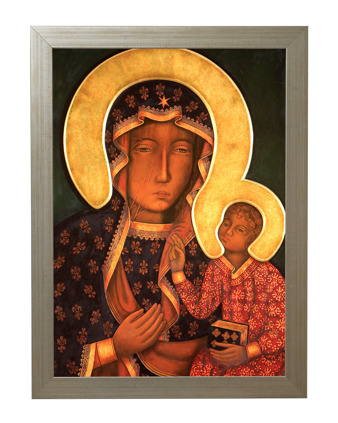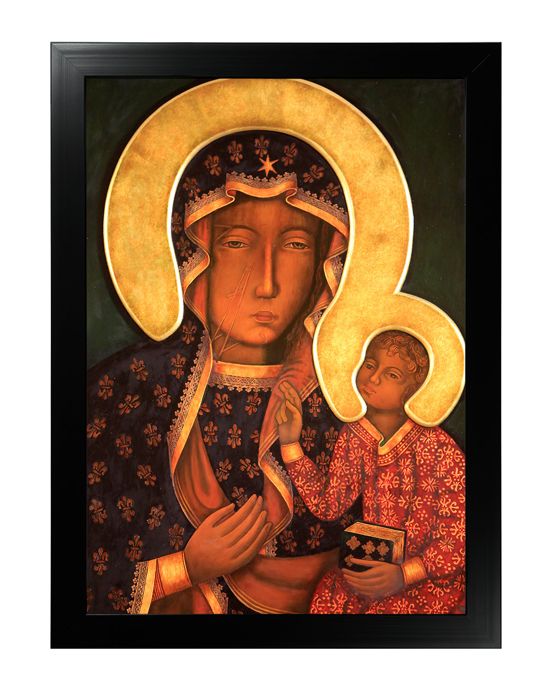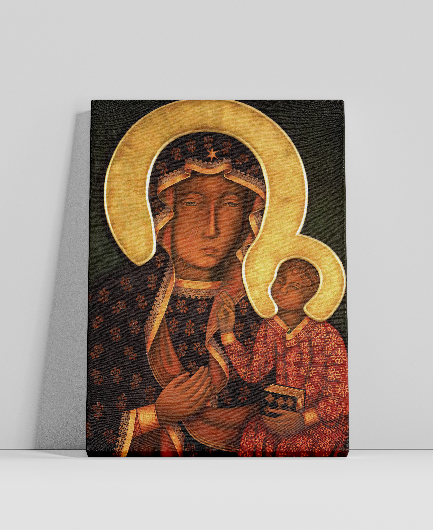 Matka Boża Częstochowska, zwana również Czarną Madonną, to jedno z najważniejszych i najczęściej czczonych wizerunków Maryi w chrześcijaństwie. Obraz ten jest przechowywany w Sanktuarium Matki Bożej Jasnogórskiej w Częstochowie, Polska. Czarną Madonnę otaczają liczne legendy i cuda, co czyni ją przedmiotem głębokiej dewocji i pielgrzymek. Maryja na tym obrazie jest ukazana jako Matka z Dzieciątkiem Jezus. Jednak to, co wyróżnia Czarną Madonnę, to jej ciemny kolor skóry, stąd nazwa. Jej postać emanuje powagą i siłą ducha. Często widziana jest w tradycyjnym stroju, z diademem na głowie i zasłoniętą chustą. Dzieciątko Jezus błogosławi wiernych rączką.Matka Boża Częstochowska ma także znamienny ślad na policzku, który według legendy pochodzi od strzały zadanej przez protestanckiego żołnierza w XVII wieku.
