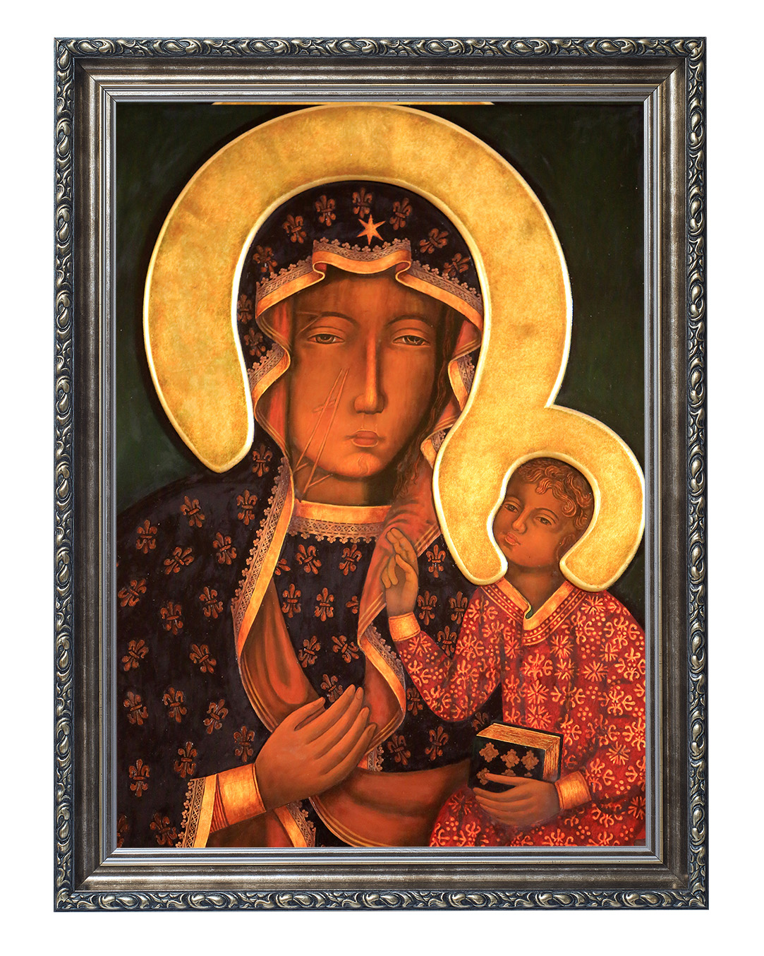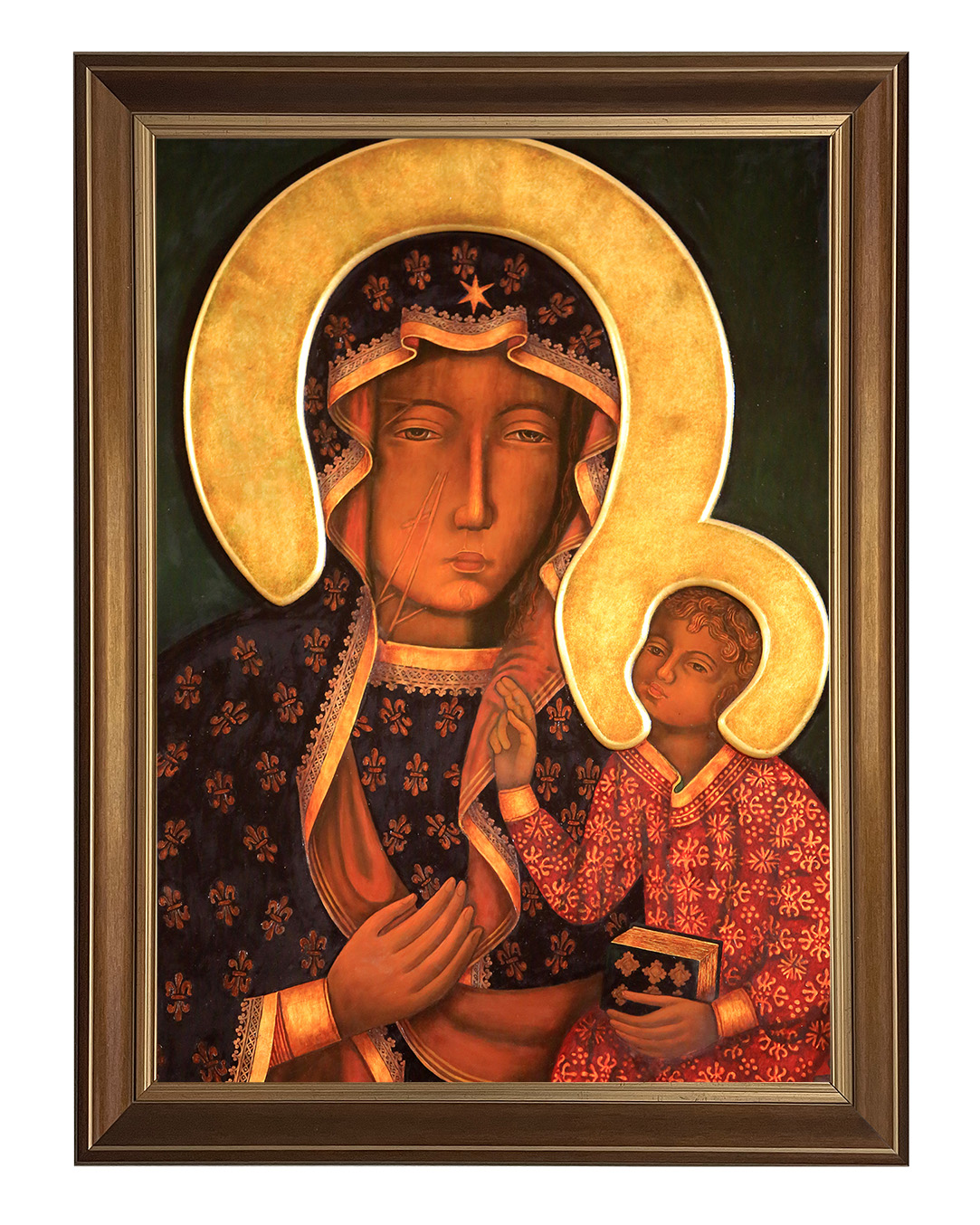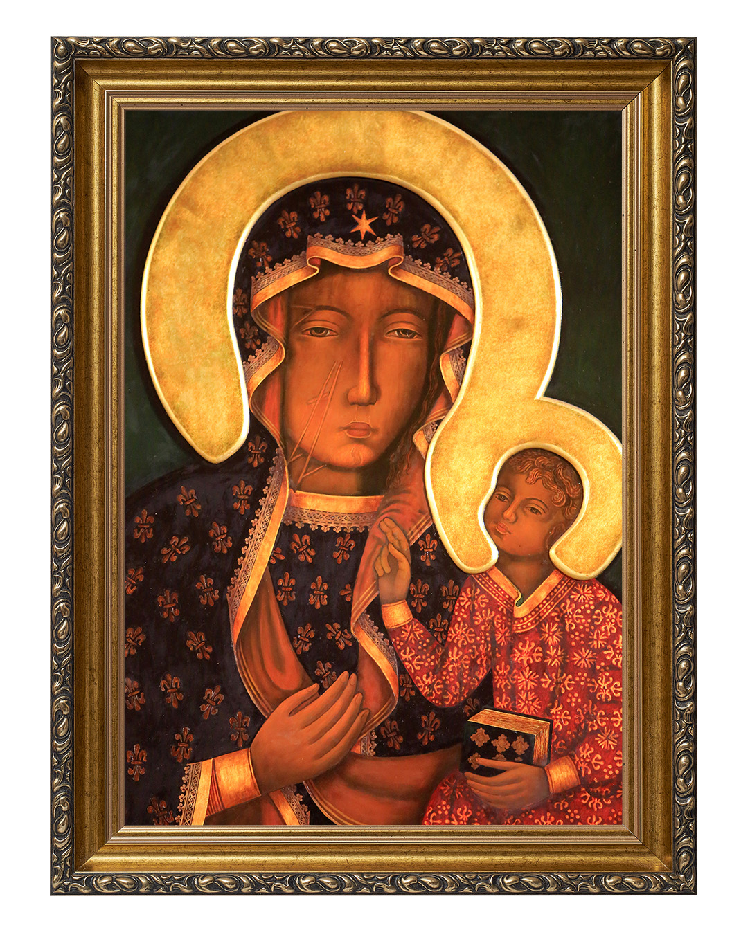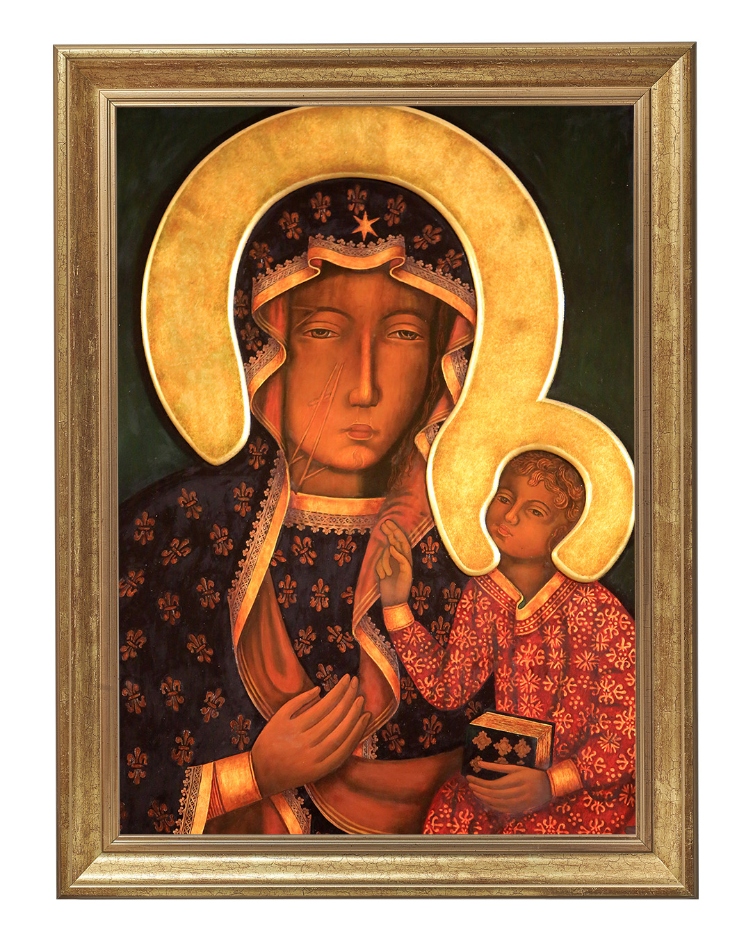 Matka Boża Częstochowska, zwana również Czarną Madonną, to jedno z najważniejszych i najczęściej czczonych wizerunków Maryi w chrześcijaństwie. Obraz ten jest przechowywany w Sanktuarium Matki Bożej Jasnogórskiej w Częstochowie, Polska. Czarną Madonnę otaczają liczne legendy i cuda, co czyni ją przedmiotem głębokiej dewocji i pielgrzymek. Maryja na tym obrazie jest ukazana jako Matka z Dzieciątkiem Jezus. Jednak to, co wyróżnia Czarną Madonnę, to jej ciemny kolor skóry, stąd nazwa. Jej postać emanuje powagą i siłą ducha. Często widziana jest w tradycyjnym stroju, z diademem na głowie i zasłoniętą chustą. Dzieciątko Jezus błogosławi wiernych rączką.Matka Boża Częstochowska ma także znamienny ślad na policzku, który według legendy pochodzi od strzały zadanej przez protestanckiego żołnierza w XVII wieku.
