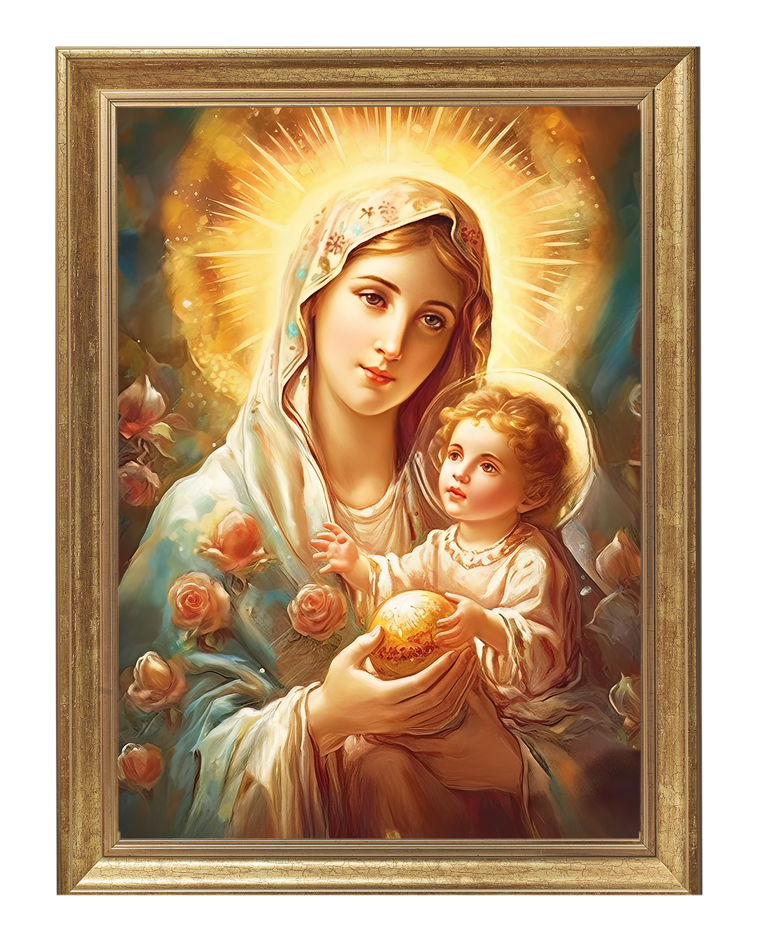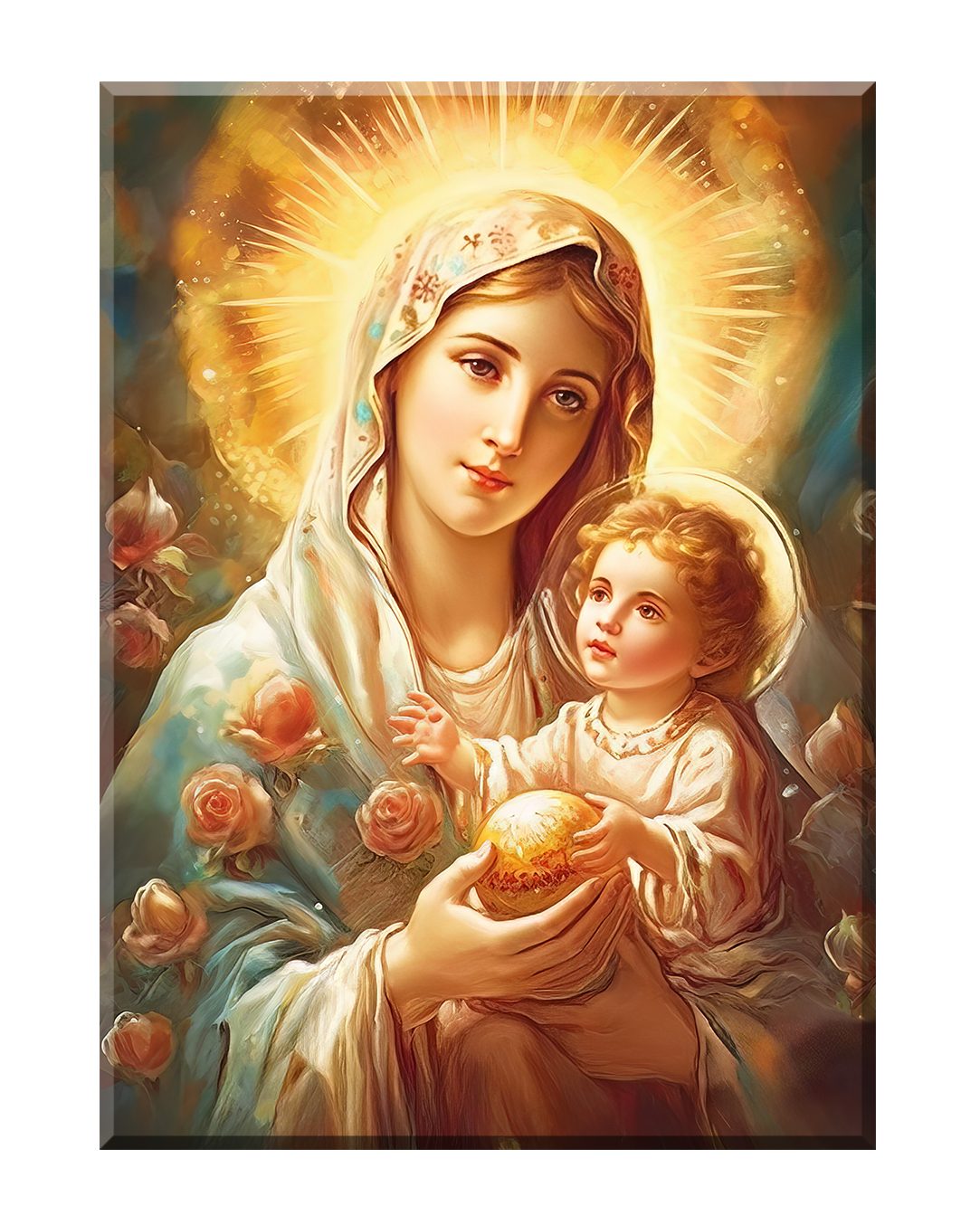 Matka Boża z Dzieciątkiem Jezus to poruszające przedstawienie matczynej opieki i miłości. W tej scenie Matka Boża pochyla głowę, aby przytulić swój policzek do policzka Syna, a ich relacja emanuje spokojem i czułością. Jej postawa jest pełna troski, a spojrzenie skierowane na Dzieciątko wyraża głęboką miłość matczyną.Matka Boża ubrana jest w szatę o delikatnych kolorach, co podkreśla Jej godność i niewinność. Cała scena emanuje harmonią i spokojem, przypominając o silnej więzi między matką a dzieckiem oraz ochronie, jaką Matka Boża oferuje swojemu potomstwu.