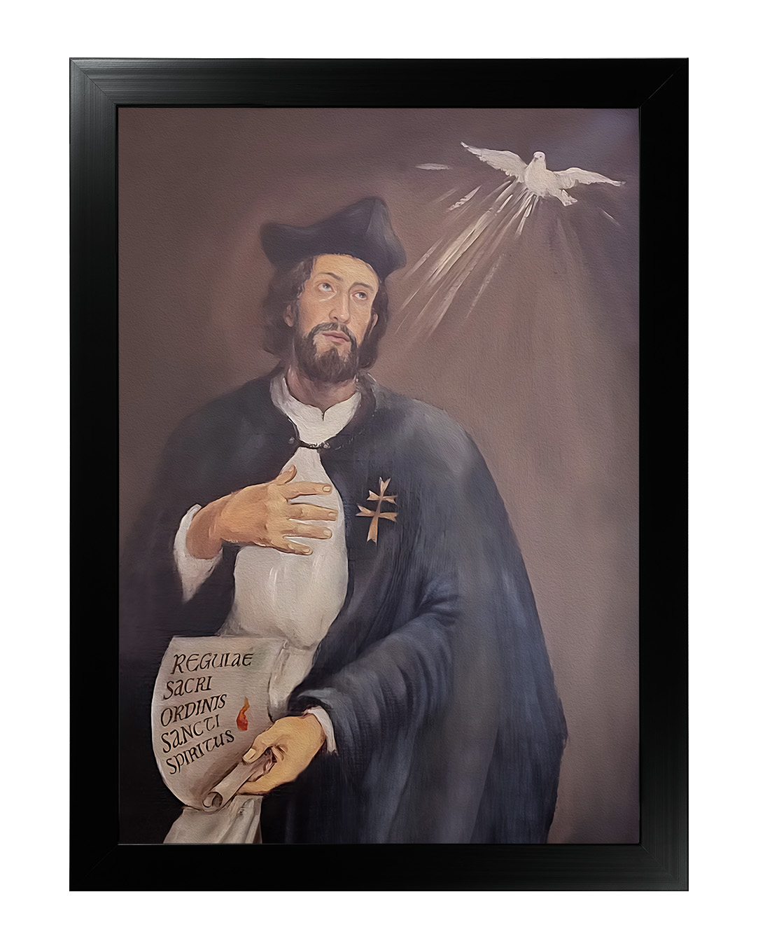 Błogosławiony Gwidon z Montpellier był francuskim szlachcicem i założycielem Zakonu Ducha Świętego (Ordo Sancti Spiritus), który zajmował się opieką nad chorymi, ubogimi i pielgrzymami. Pochodził z zamożnej rodziny, ale zrezygnował z dóbr materialnych, aby poświęcić się służbie potrzebującym. Jego zakon szybko rozprzestrzenił się po Europie, zakładając szpitale i schroniska. Gwidon zmarł w opinii świętości, a jego dzieło kontynuowane jest do dziś przez jego zakon. Wspomnienie liturgiczne błogosławionego Gwidona obchodzone jest 6 lutego.Dlaczego warto kupić obraz z wizerunkiem błogosławionego Gwidona z Montpellier?