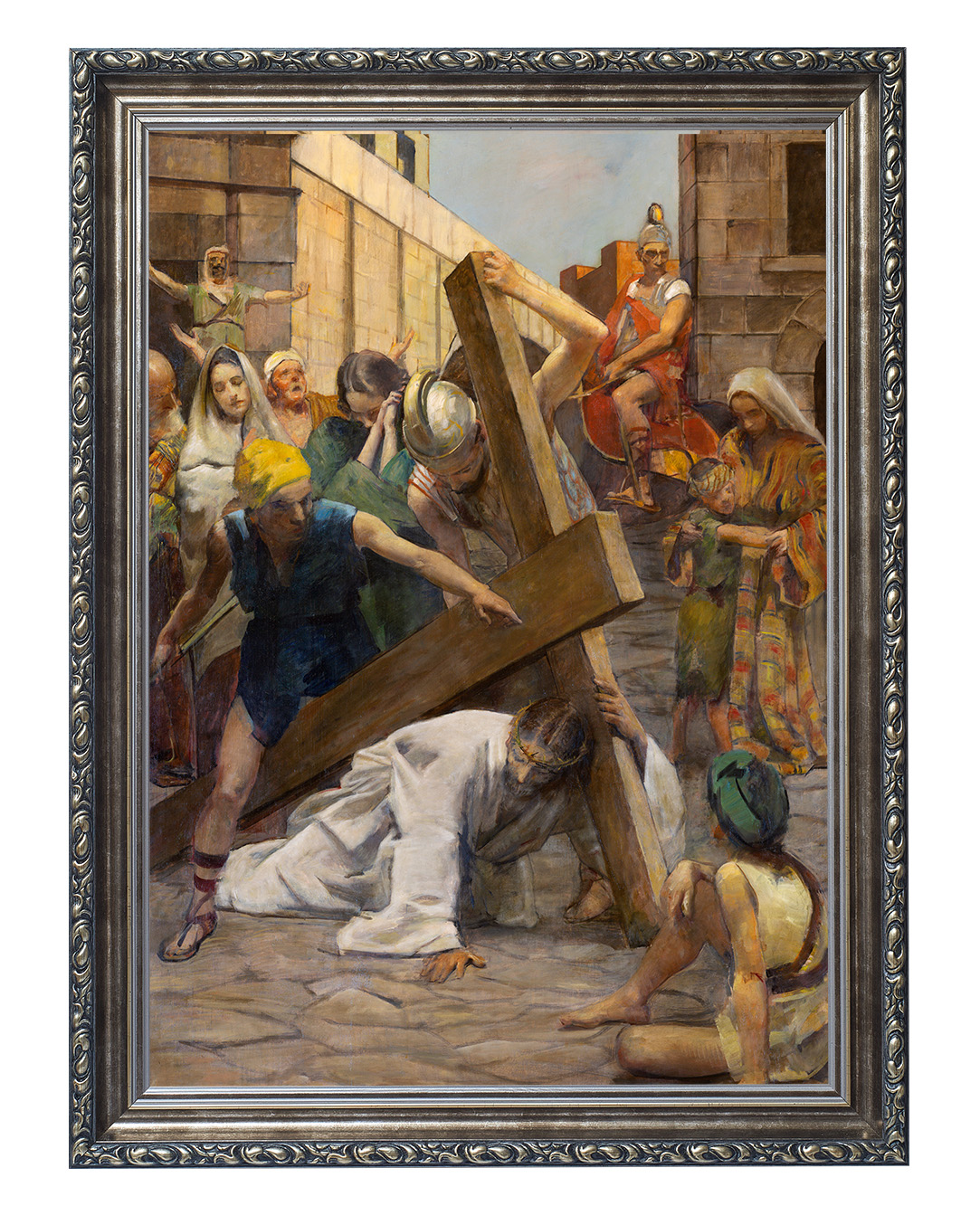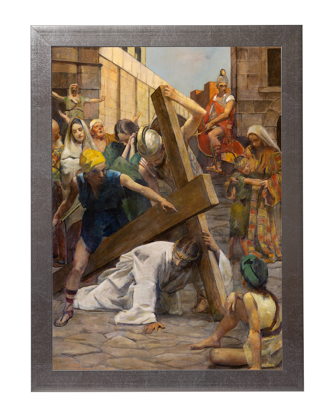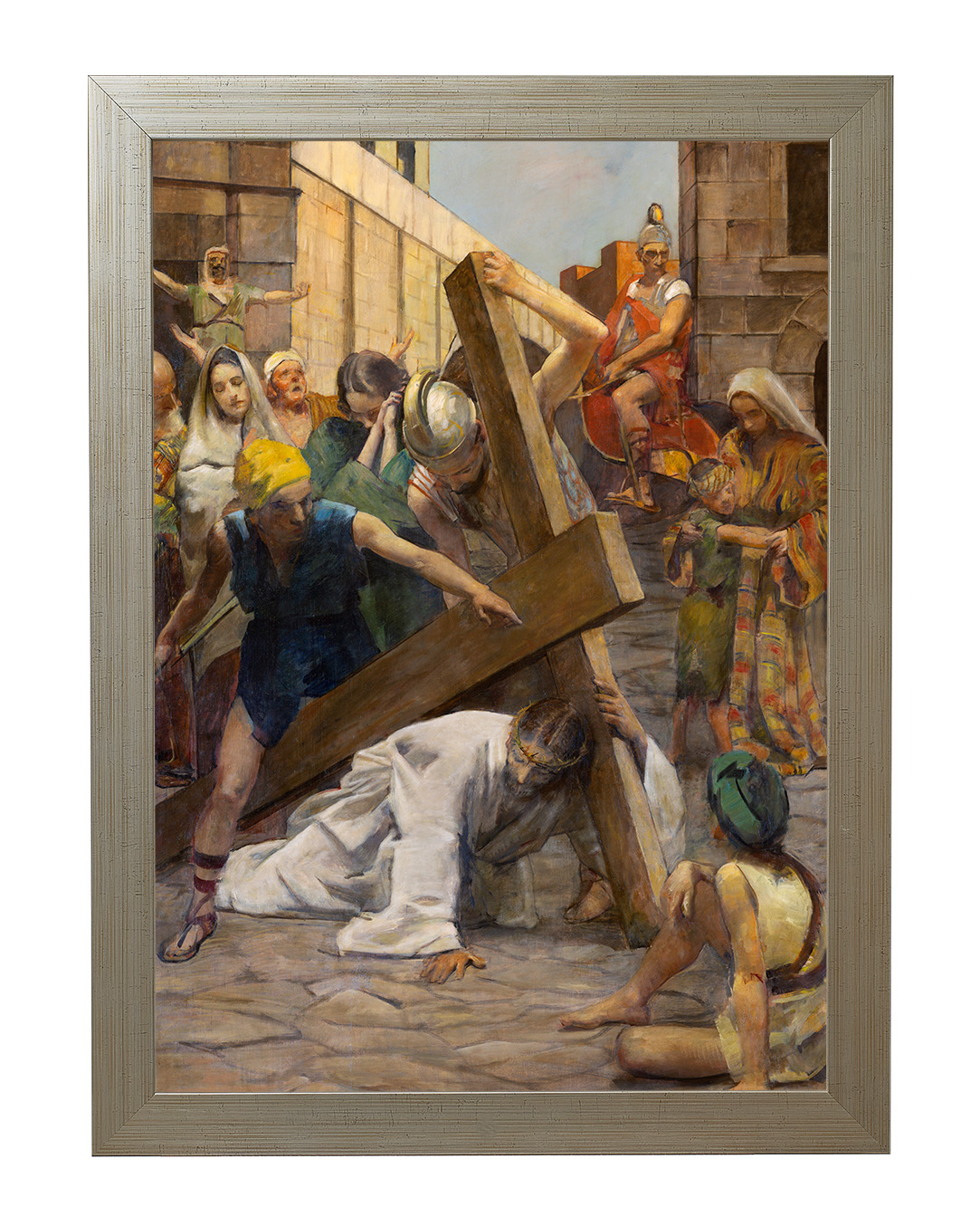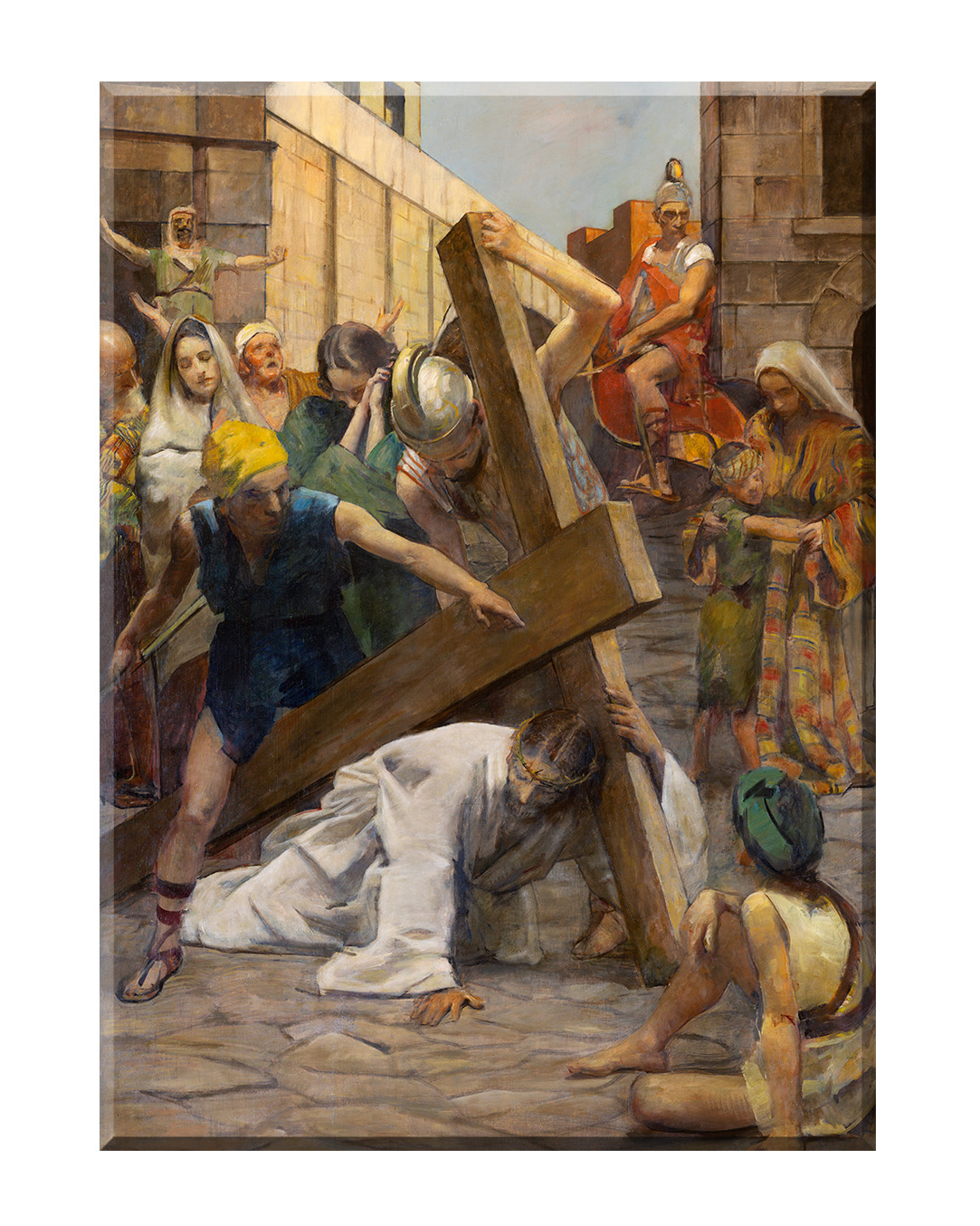 Siódma stacja Drogi Krzyżowej ukazuje moment, w którym Jezus upada po raz drugi pod ciężarem krzyża. Scena przedstawia Jezusa leżącego na ziemi, otoczonego przez współczujące kobiety i surowych rzymskich żołnierzy, co podkreśla Jego nieskończoną cierpliwość i siłę w obliczu cierpienia.