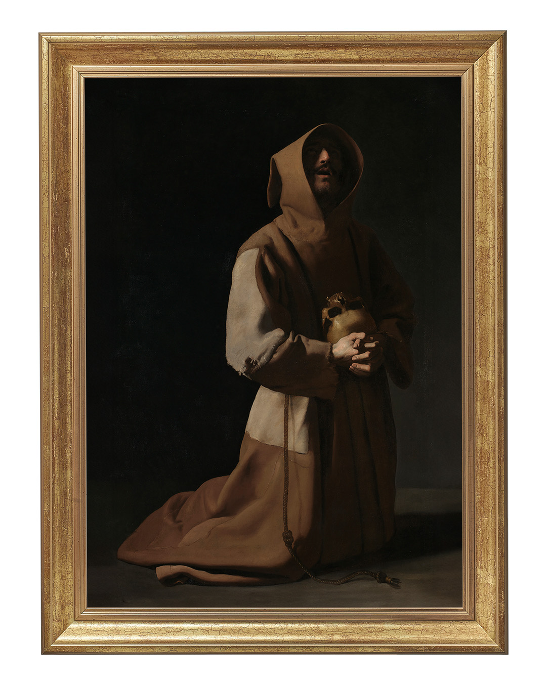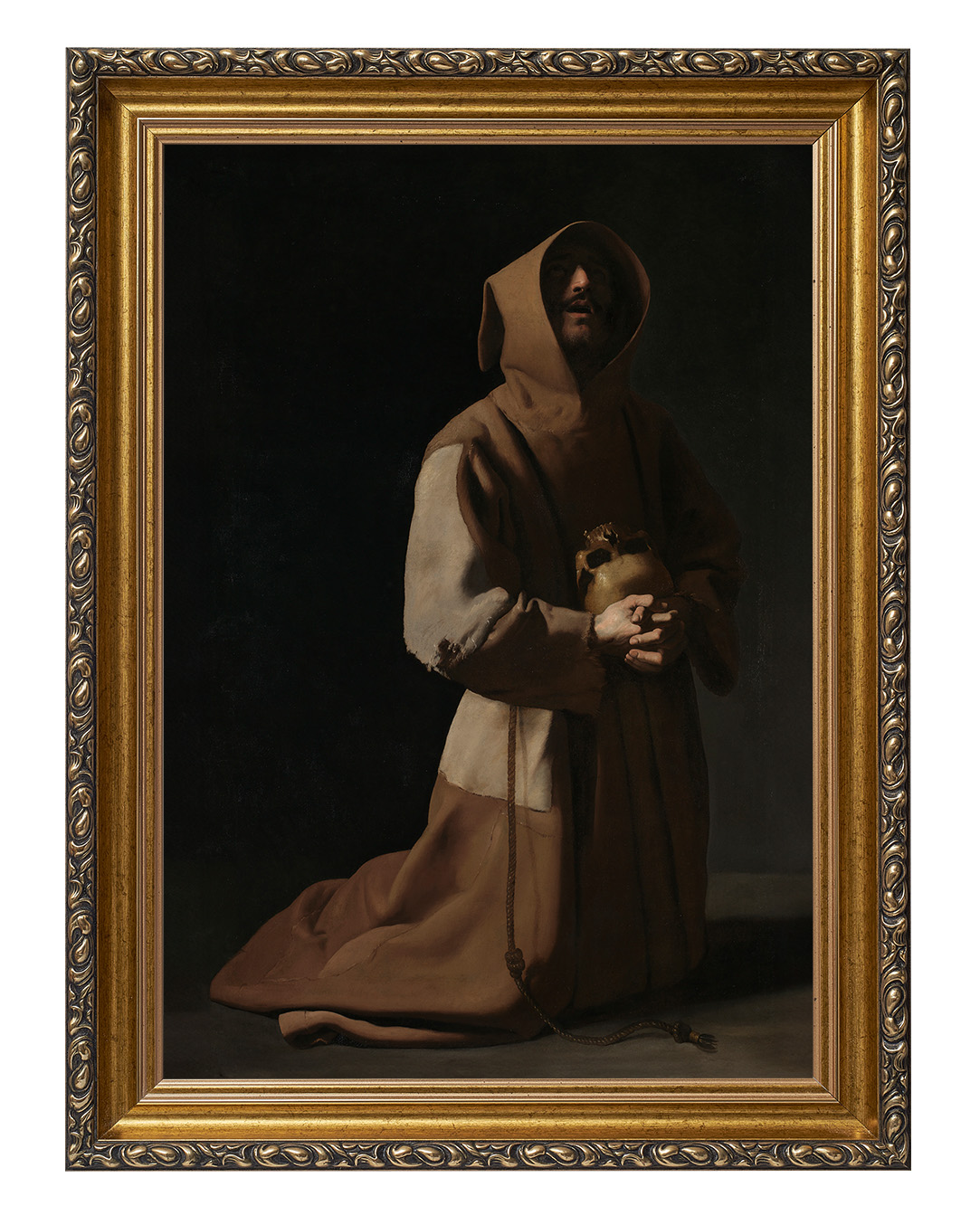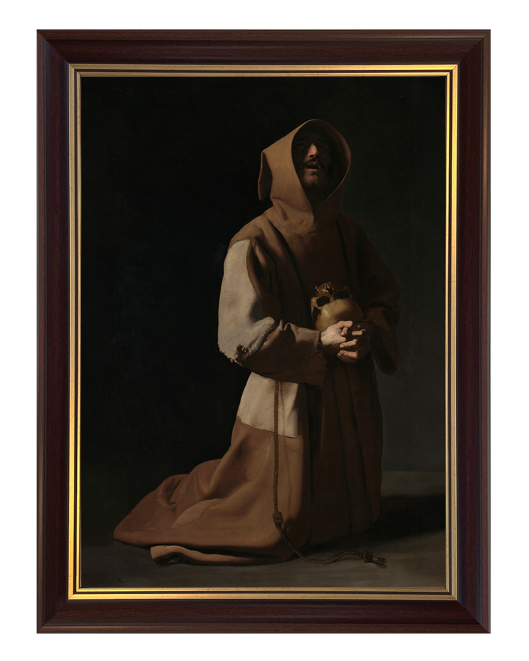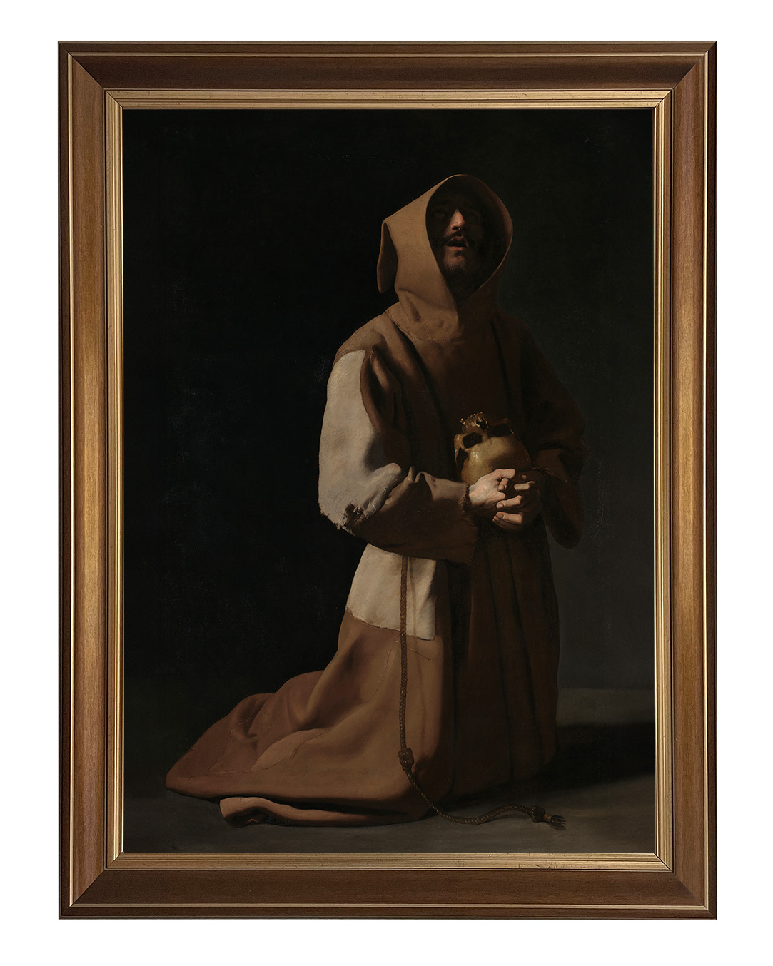Założyciel zakonu franciszkanów, a pośrednio także klarysek i tercjarzy. Misjonarz, mistyk średniowieczny, stygmatyk oraz Święty Kościoła katolickiego. Po usłyszeniu słów dotyczących stylu życia apostolskiego, zdjął habit eremicki i zaczął nosić prostą brązową tunikę - strój, który ówcześnie uważany był za typowo plebejski i z bosymi stopami zaczął wzywać ludzi do czynienia pokuty.Wprowadź do swojego wnętrza nutę mistycznej duchowości z naszym niezwykłym obrazem przedstawiającym Świętego Franciszka. Ten wyjątkowy obraz emanuje spokojem i głęboką refleksją, ukazując postać Świętego Franciszka z Asyżu, który w pokorze i kontemplacji trzyma w rękach czaszkę – symbol przemijalności życia.