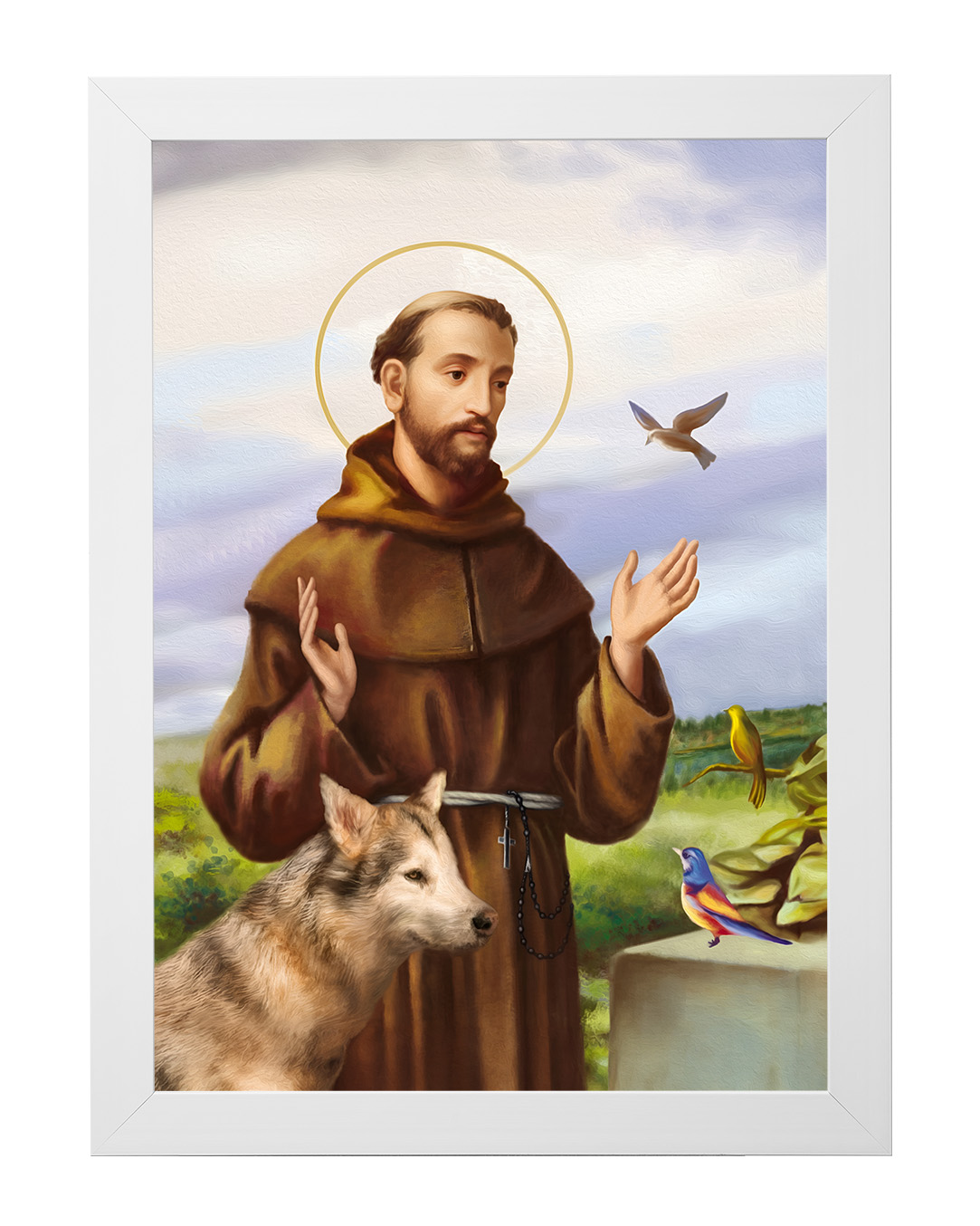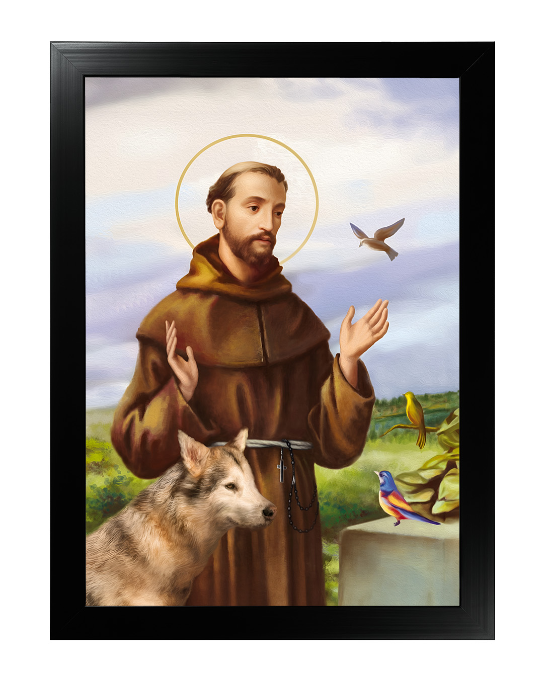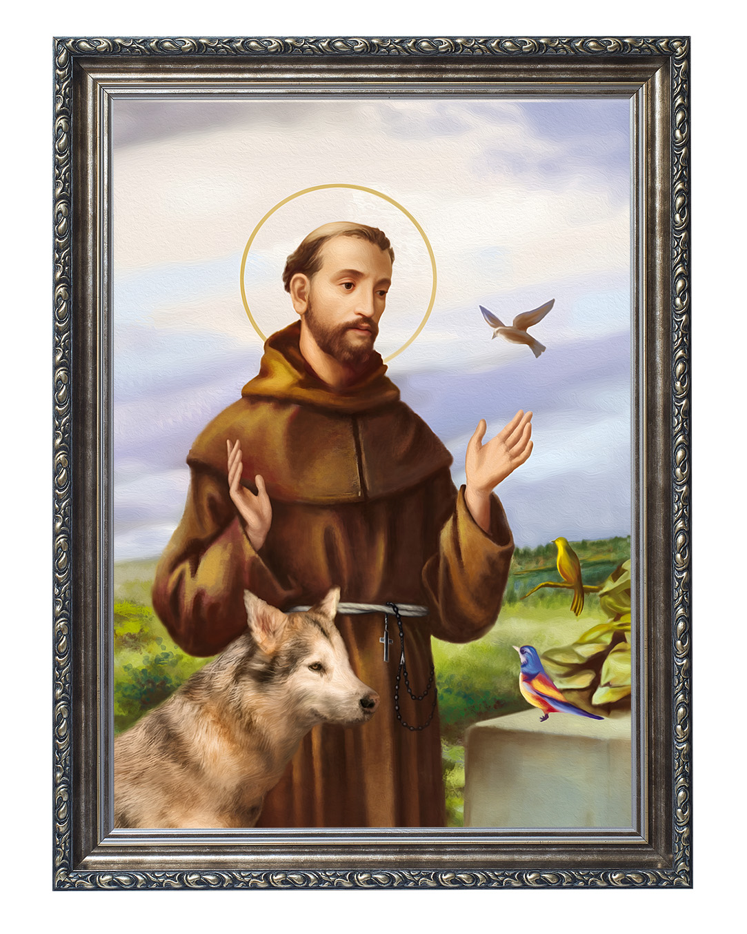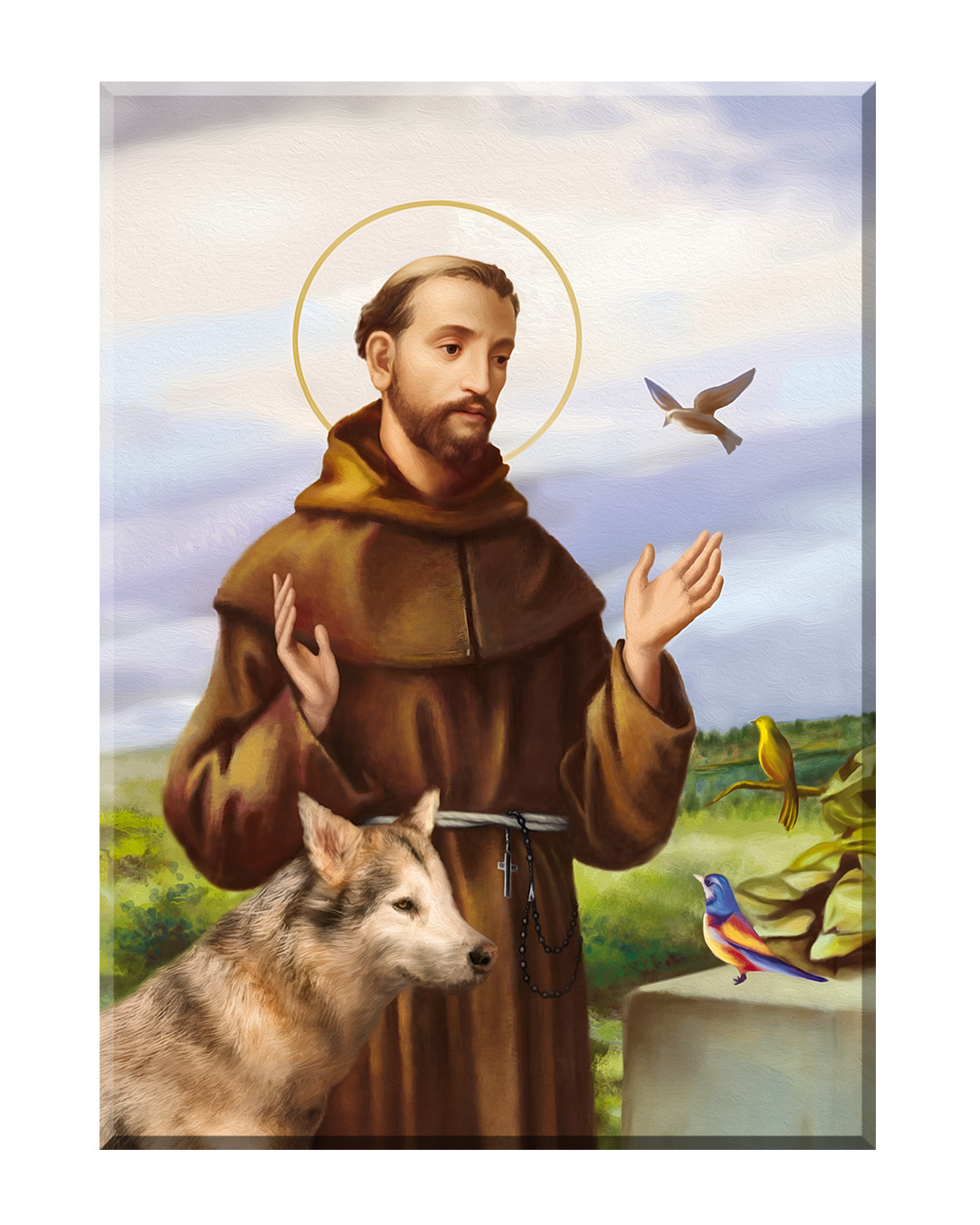 Założyciel zakonu franciszkanów, a pośrednio także klarysek i tercjarzy. Misjonarz, mistyk średniowieczny, stygmatyk oraz Święty Kościoła katolickiego. Po usłyszeniu słów dotyczących stylu życia apostolskiego, zdjął habit eremicki i zaczął nosić prostą brązową tunikę - strój, który ówcześnie uważany był za typowo plebejski i z bosymi stopami zaczął wzywać ludzi do czynienia pokuty.Zanurz się w spokojnej aurze tego wyjątkowego obrazu, przedstawiającego Świętego Franciszka z Asyżu – patrona ekologii, przyrody i zwierząt. Ten piękny wizerunek ukazuje Świętego w towarzystwie zwierząt, co odzwierciedla jego głęboką więź z naturą oraz miłość do wszystkich stworzeń. Na obrazie możemy dostrzec wilka, który symbolizuje pokój i pojednanie, a także kolorowe ptaki, które są symbolem harmonii i radości.