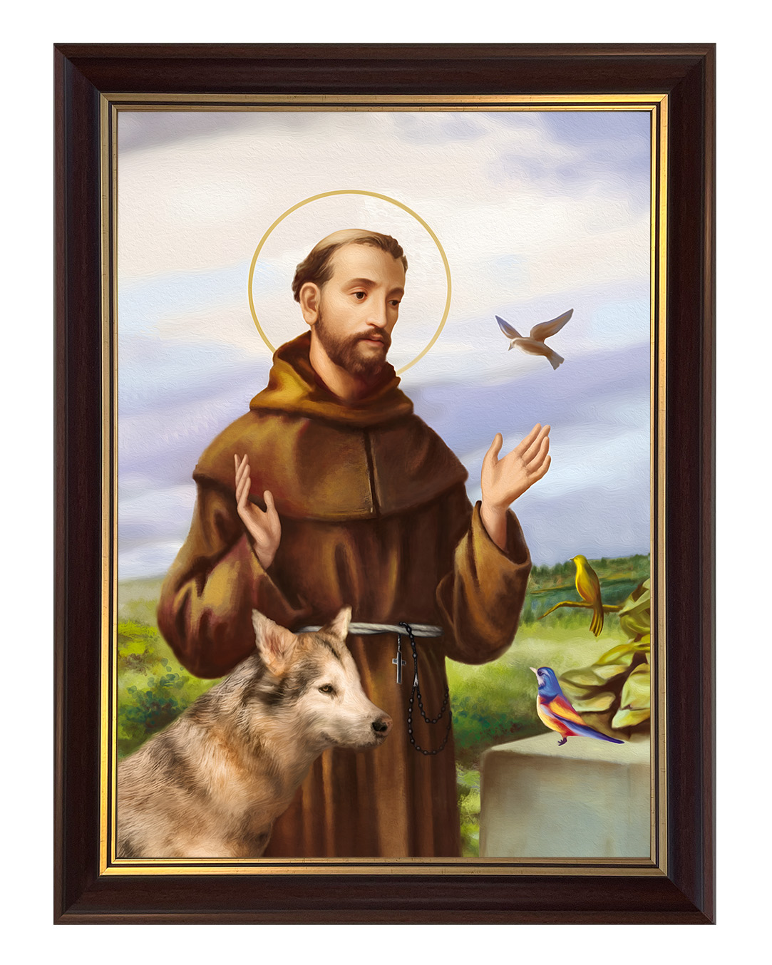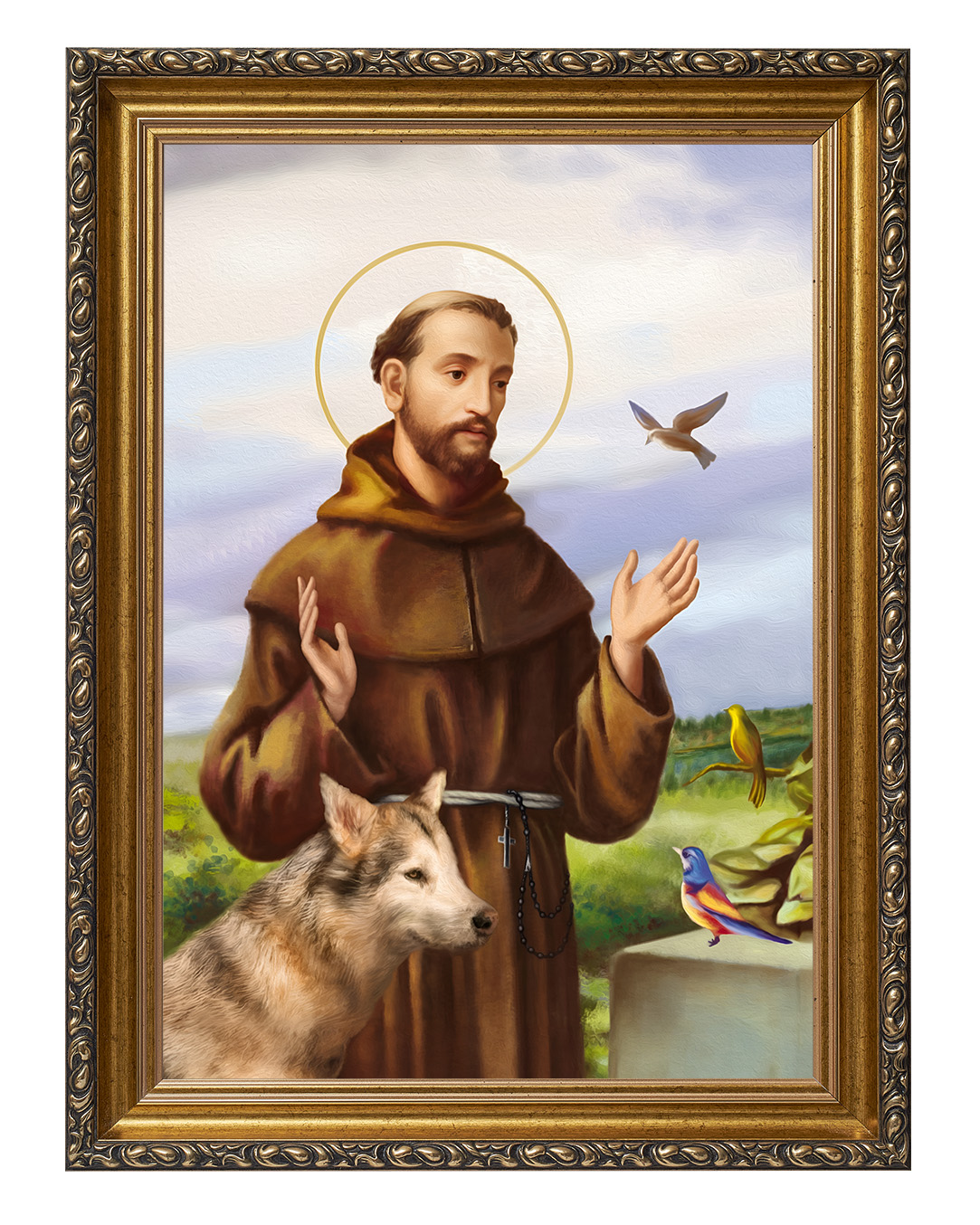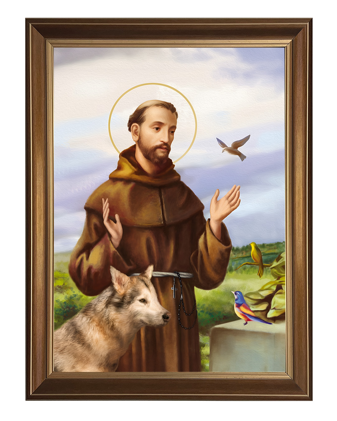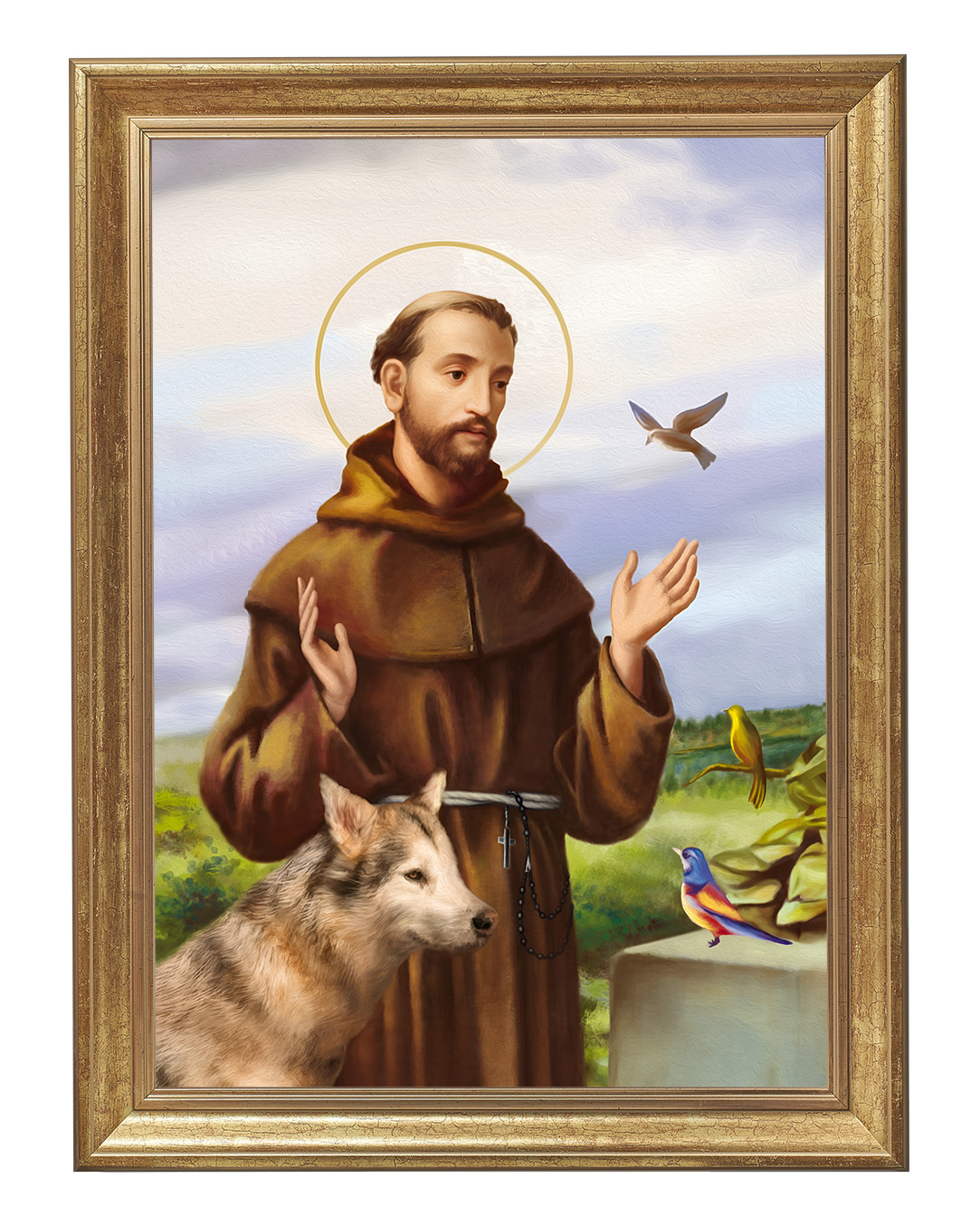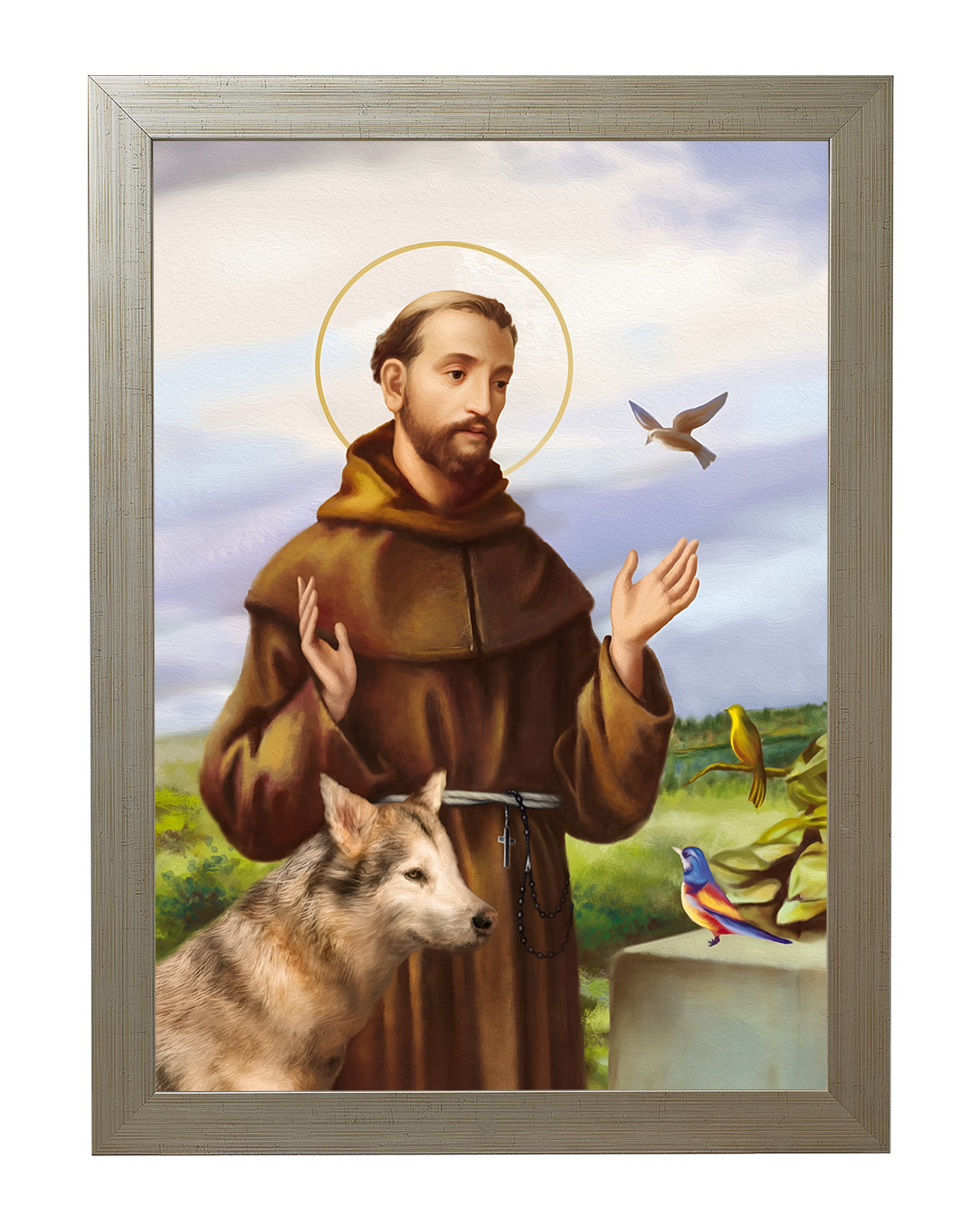 Założyciel zakonu franciszkanów, a pośrednio także klarysek i tercjarzy. Misjonarz, mistyk średniowieczny, stygmatyk oraz Święty Kościoła katolickiego. Po usłyszeniu słów dotyczących stylu życia apostolskiego, zdjął habit eremicki i zaczął nosić prostą brązową tunikę - strój, który ówcześnie uważany był za typowo plebejski i z bosymi stopami zaczął wzywać ludzi do czynienia pokuty.Zanurz się w spokojnej aurze tego wyjątkowego obrazu, przedstawiającego Świętego Franciszka z Asyżu – patrona ekologii, przyrody i zwierząt. Ten piękny wizerunek ukazuje Świętego w towarzystwie zwierząt, co odzwierciedla jego głęboką więź z naturą oraz miłość do wszystkich stworzeń. Na obrazie możemy dostrzec wilka, który symbolizuje pokój i pojednanie, a także kolorowe ptaki, które są symbolem harmonii i radości.