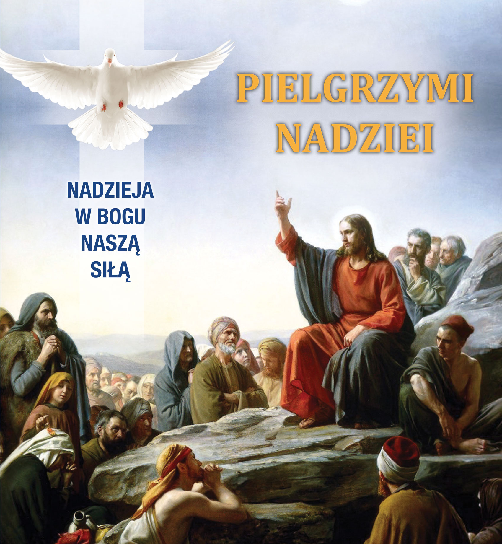 Napis „Nadzieja w Bogu naszą siłą” podkreśla przesłanie duchowego wsparcia i wiary, a hasło „Pielgrzymi Nadziei” zachęca do refleksji nad osobistą wędrówką ku Bogu.