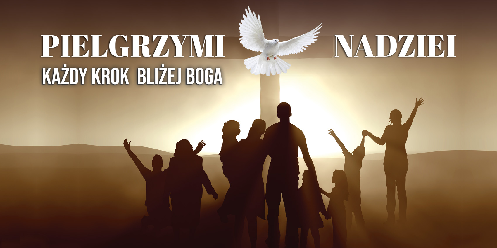 Baner przedstawia grupę wiernych stojących na tle zachodzącego słońca, z wyciągniętymi w górę rękami w geście radości i uwielbienia. W centralnej części, na tle krzyża, widać dużego, białego gołębia, symbolizującego pokój i Ducha Świętego. Grafika religijna ma spokojne, brązowo-złote tony, które nadają jej ciepłą i duchową atmosferę.