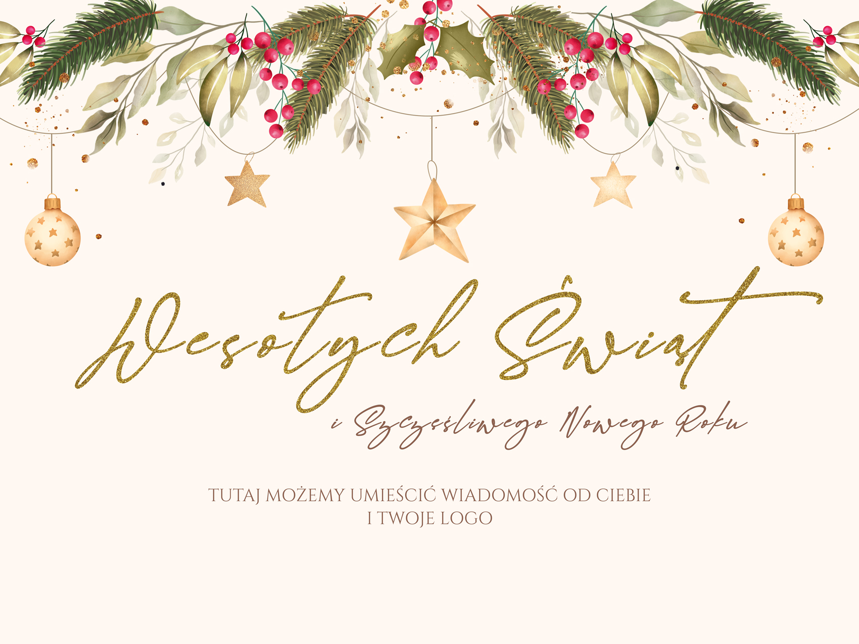 Główne hasło "Wesołych Świąt" napisane jest ozdobną, kaligraficzną czcionką w kolorze złota, co przyciąga uwagę i podkreśla wagę życzeń. Dodatkowy napis "i Szczęśliwego Nowego Roku" uzupełnia przekaz, zapisany mniejszą, subtelną czcionką. Dolna część baneru oferuje miejsce na własną wiadomość lub logo, co pozwala dostosować go do indywidualnych potrzeb i podkreślić unikalny charakter przekazu.