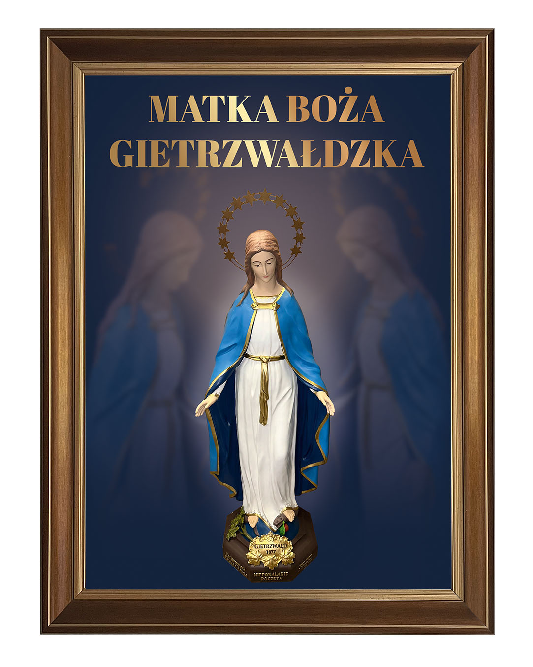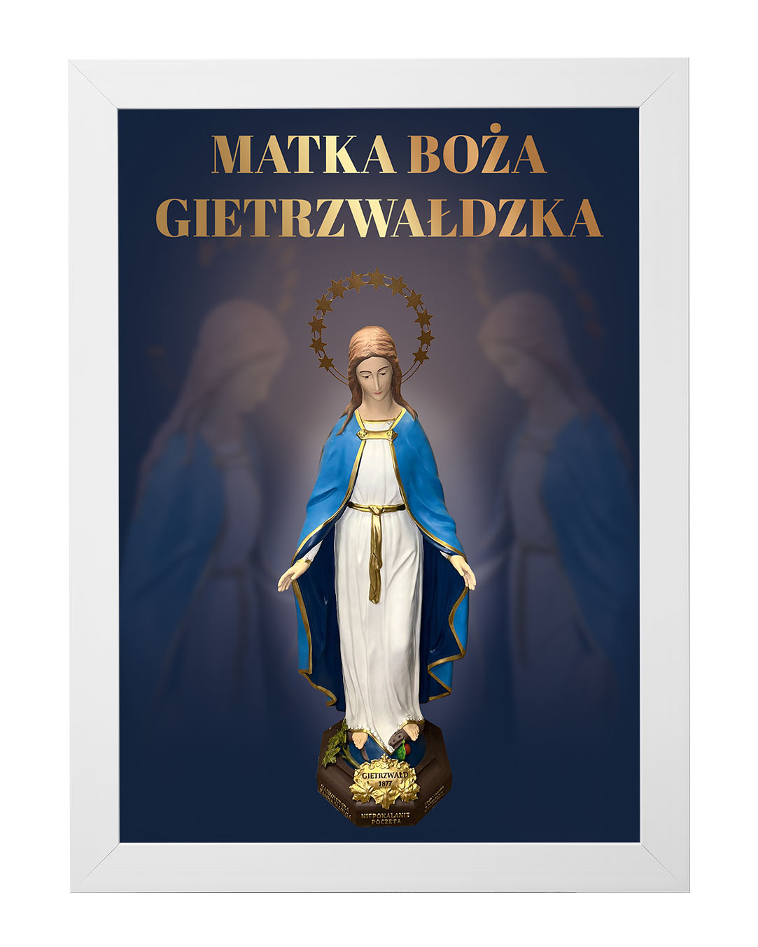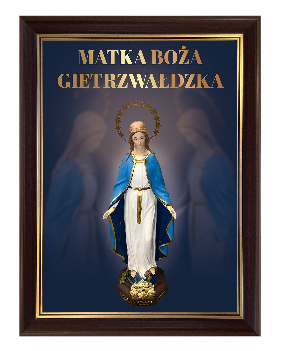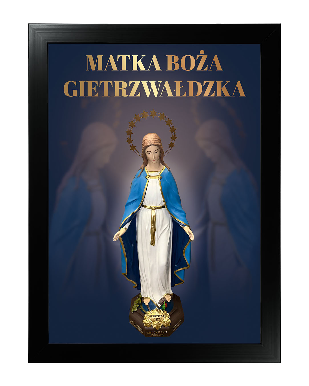Obraz z figurą Matki Bożej Gietrzwałdzkiej przedstawia Najświętszą Pannę Maryję Niepokalaną na tle malowniczego krajobrazu Gietrzwałdu z widocznym sanktuarium. Figura Matki Bożej, ukoronowana gwiazdami, przypomina o objawieniach maryjnych z 1877 roku, będących źródłem wiary i nadziei dla wielu wiernych.Ten obraz doskonale nadaje się do każdego domu, wprowadzając atmosferę pokoju i inspirując do modlitwy oraz refleksji nad cudami związanymi z tym świętym miejscem.