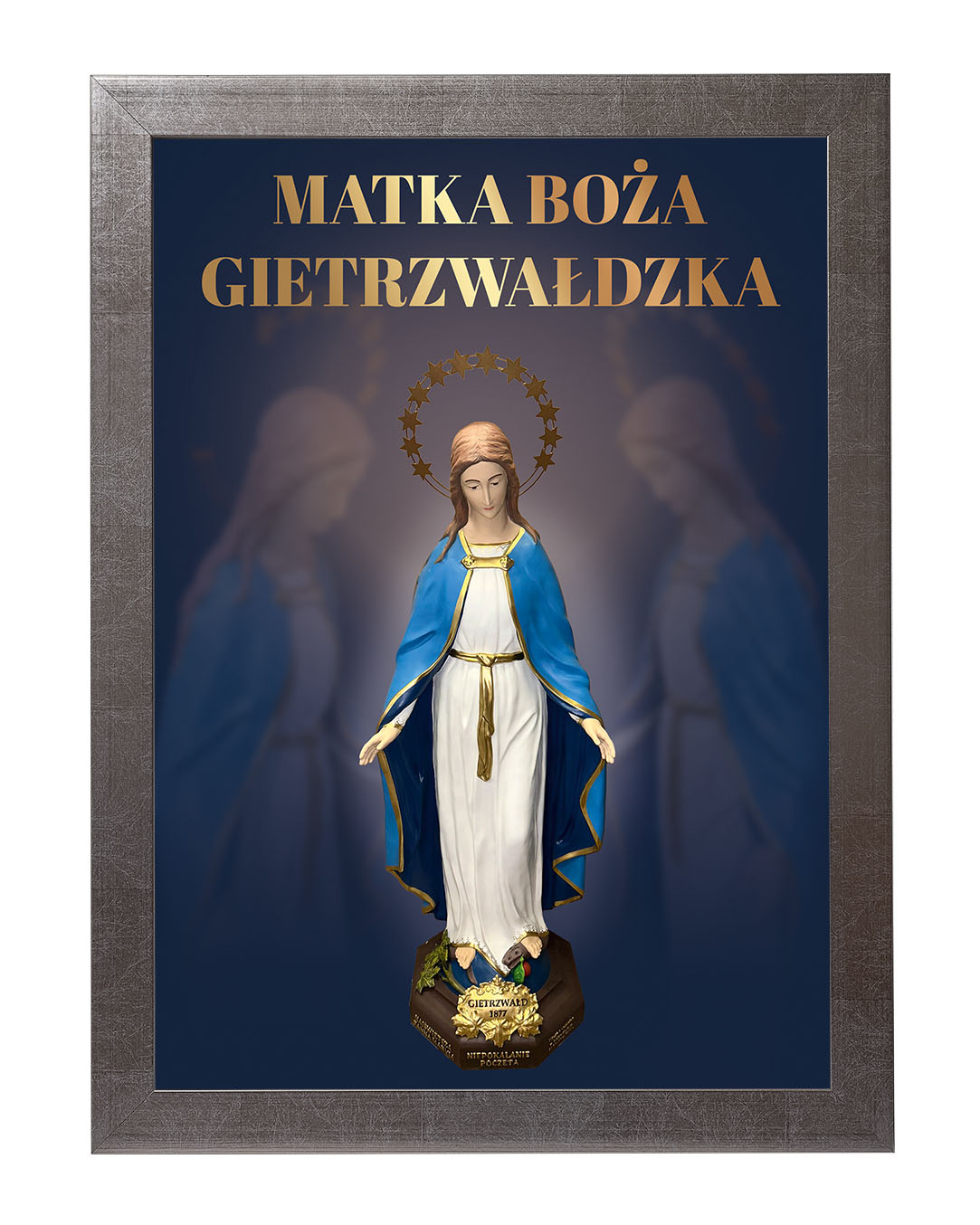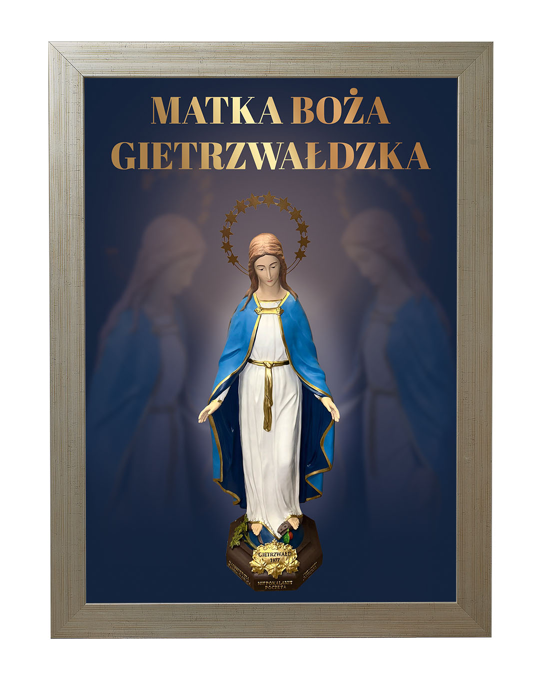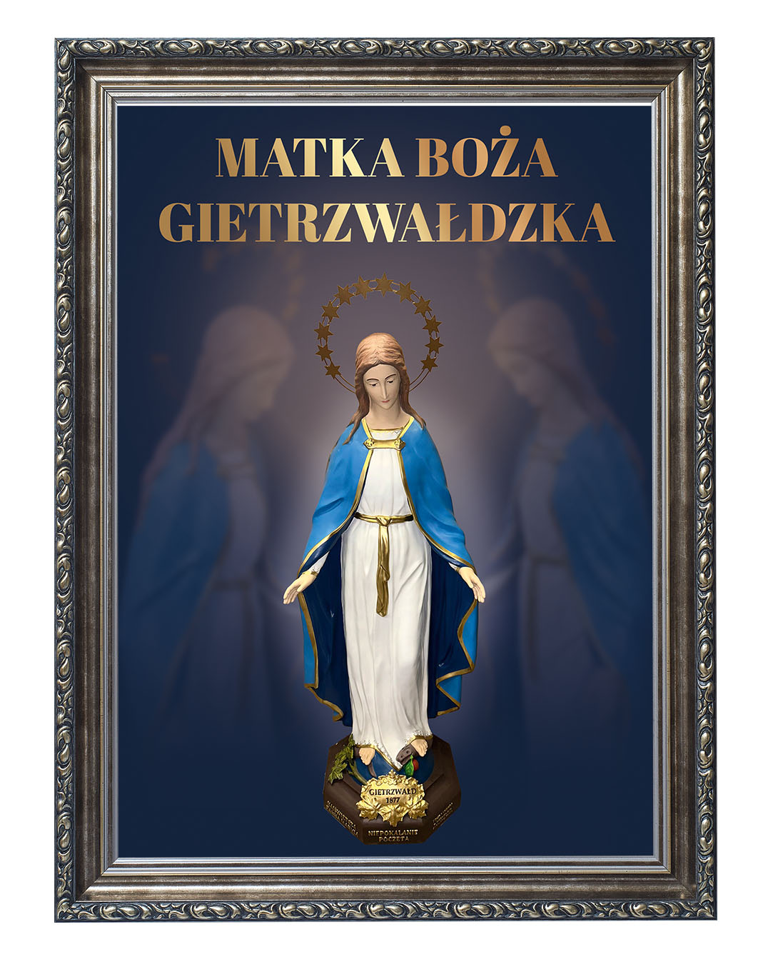 Obraz z figurą Matki Bożej Gietrzwałdzkiej przedstawia Najświętszą Pannę Maryję Niepokalaną na tle malowniczego krajobrazu Gietrzwałdu z widocznym sanktuarium. Figura Matki Bożej, ukoronowana gwiazdami, przypomina o objawieniach maryjnych z 1877 roku, będących źródłem wiary i nadziei dla wielu wiernych.Ten obraz doskonale nadaje się do każdego domu, wprowadzając atmosferę pokoju i inspirując do modlitwy oraz refleksji nad cudami związanymi z tym świętym miejscem.