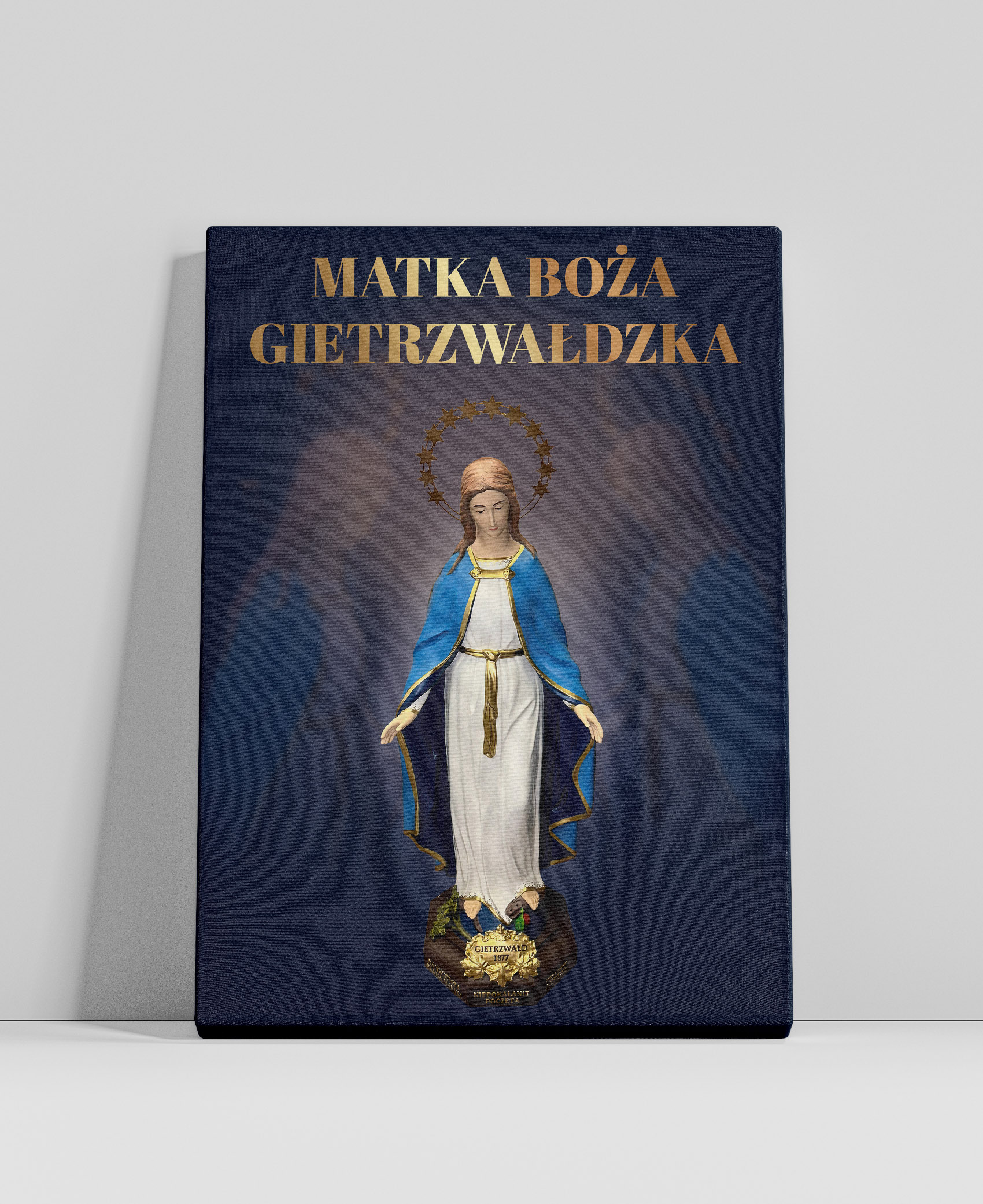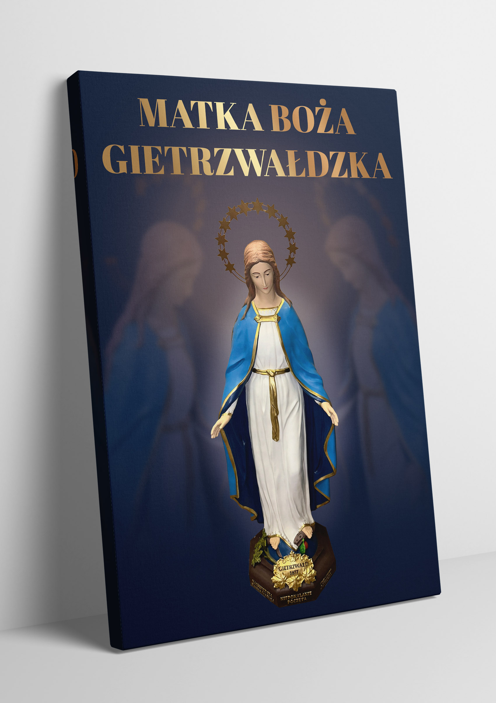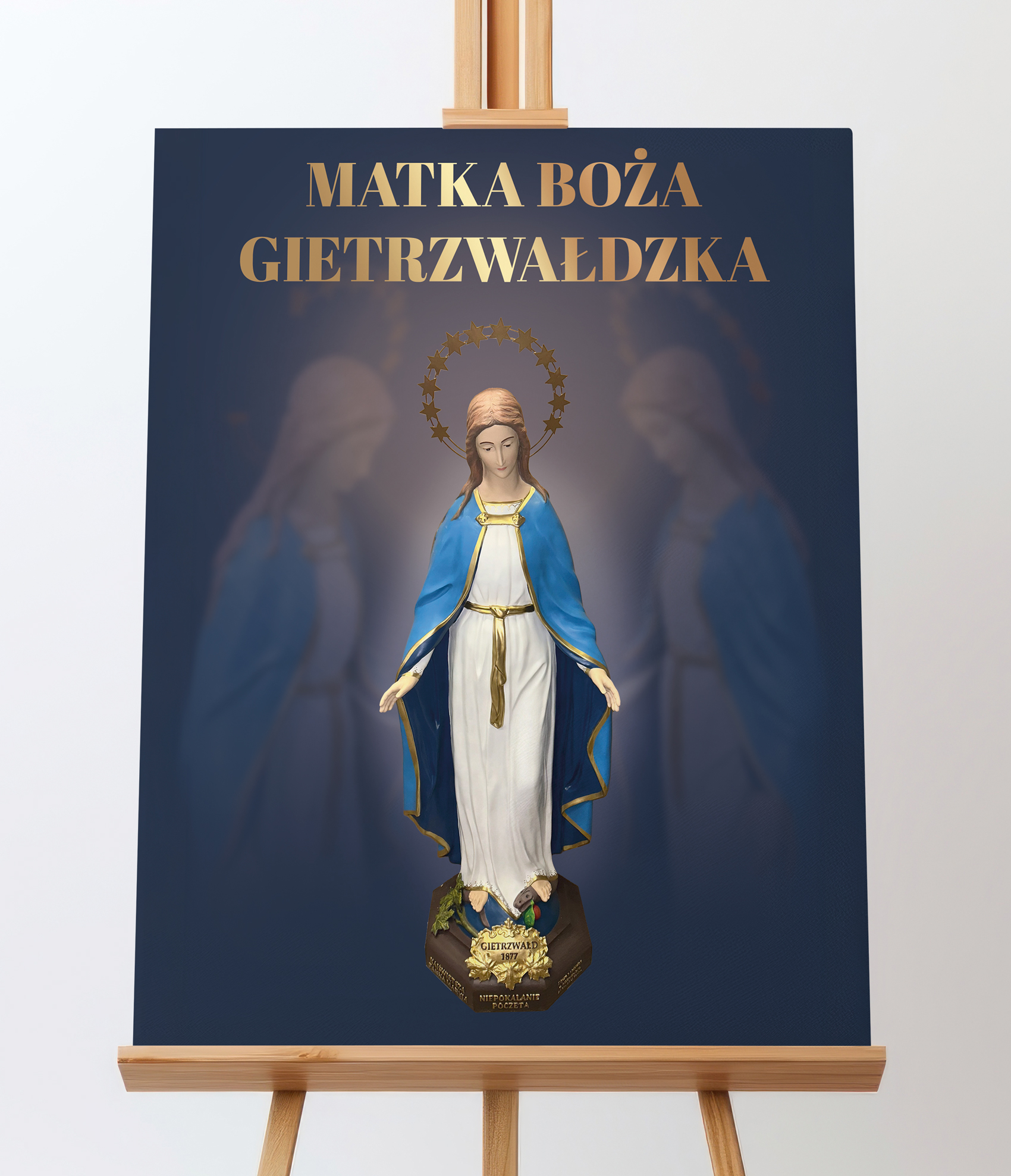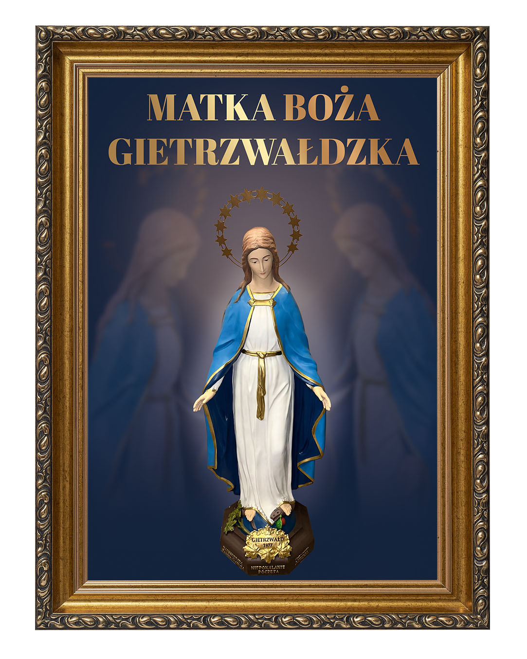 Obraz z figurą Matki Bożej Gietrzwałdzkiej przedstawia Najświętszą Pannę Maryję Niepokalaną na tle malowniczego krajobrazu Gietrzwałdu z widocznym sanktuarium. Figura Matki Bożej, ukoronowana gwiazdami, przypomina o objawieniach maryjnych z 1877 roku, będących źródłem wiary i nadziei dla wielu wiernych.Ten obraz doskonale nadaje się do każdego domu, wprowadzając atmosferę pokoju i inspirując do modlitwy oraz refleksji nad cudami związanymi z tym świętym miejscem.